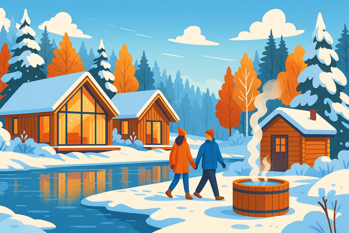 Вечером, когда зажигаются огни и отражаются в воде, это превращается в настоящий зимний ритуал релакса. После прогулки по заснеженному берегу особенно приятно зайти в тёплую баню, где пахнет деревом и трещат дрова.
