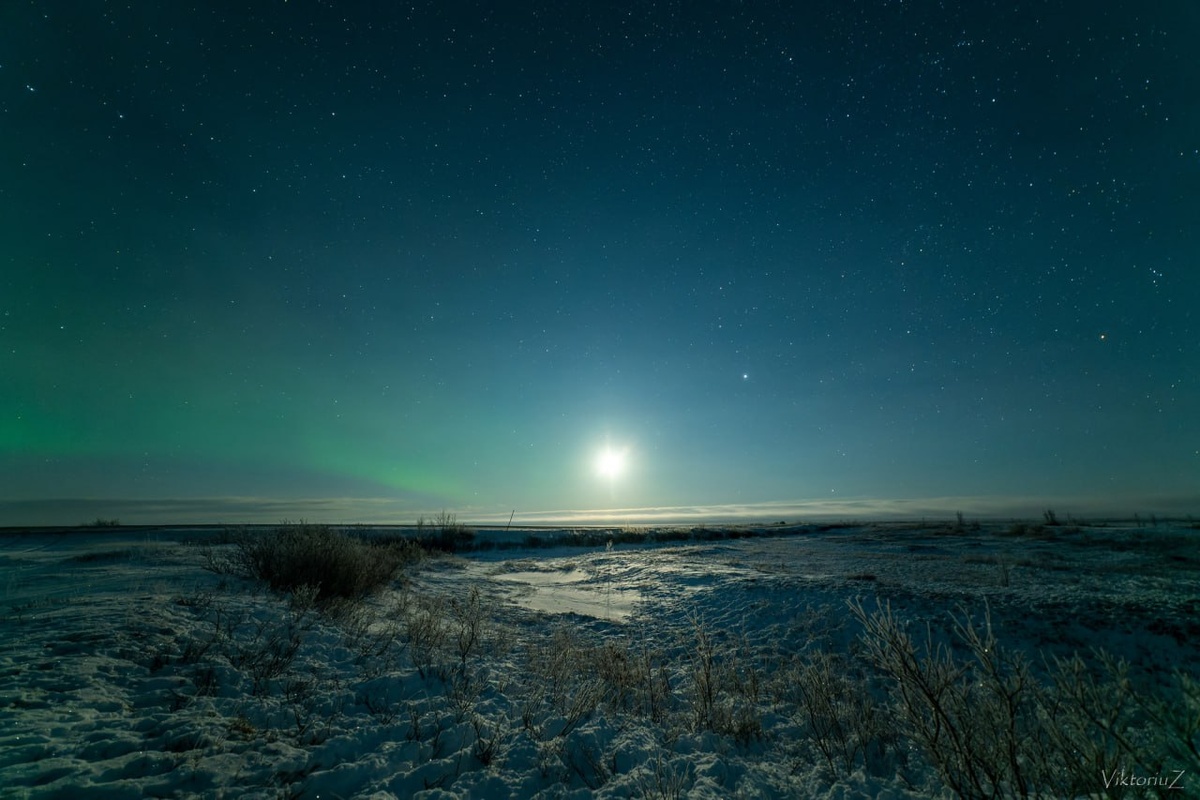 11.11.2025 Сегодня прогноз сияния был впечатляющим. Но как назло небо над городом стало затягивать. Поэтому поехал в тундру, на р. Северную, которая находится примерно в 45 км от города. Но сияния почти не было, зато там было много свежих следов оленей и саней оленевода. Интересно было походить посмотреть, как и где они переходили реку🙂 Z6II+Nikon Z 20 mm, 6 sec, f/2.8, ISO2000 D850+Samyang 14 mm, 8 sec, f/2.8, ISO2000