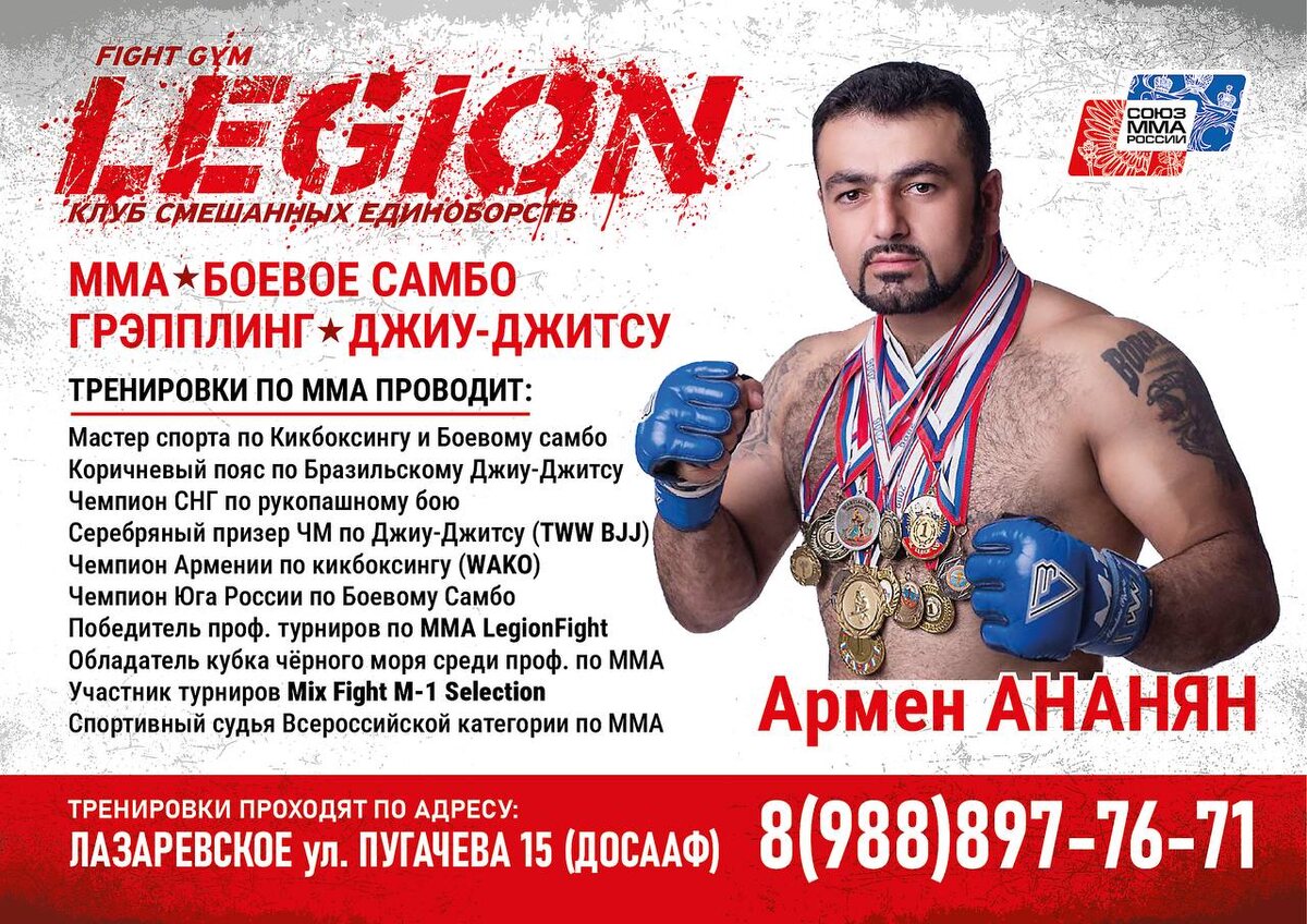 Приглашаем на тренировки по ММА и Боевому Самбо. Тренировки проходят в ДОСААФе по адресу пос Лазаревское ул Пугачева 15 Дни занятий: - вторник четверг субботу Младшая группа (с 6-14 лет) в - Старшая группа (с 15 - 40 лет ) с - По вопросам тренировок звоните по телефону: ☎️ +79888977671