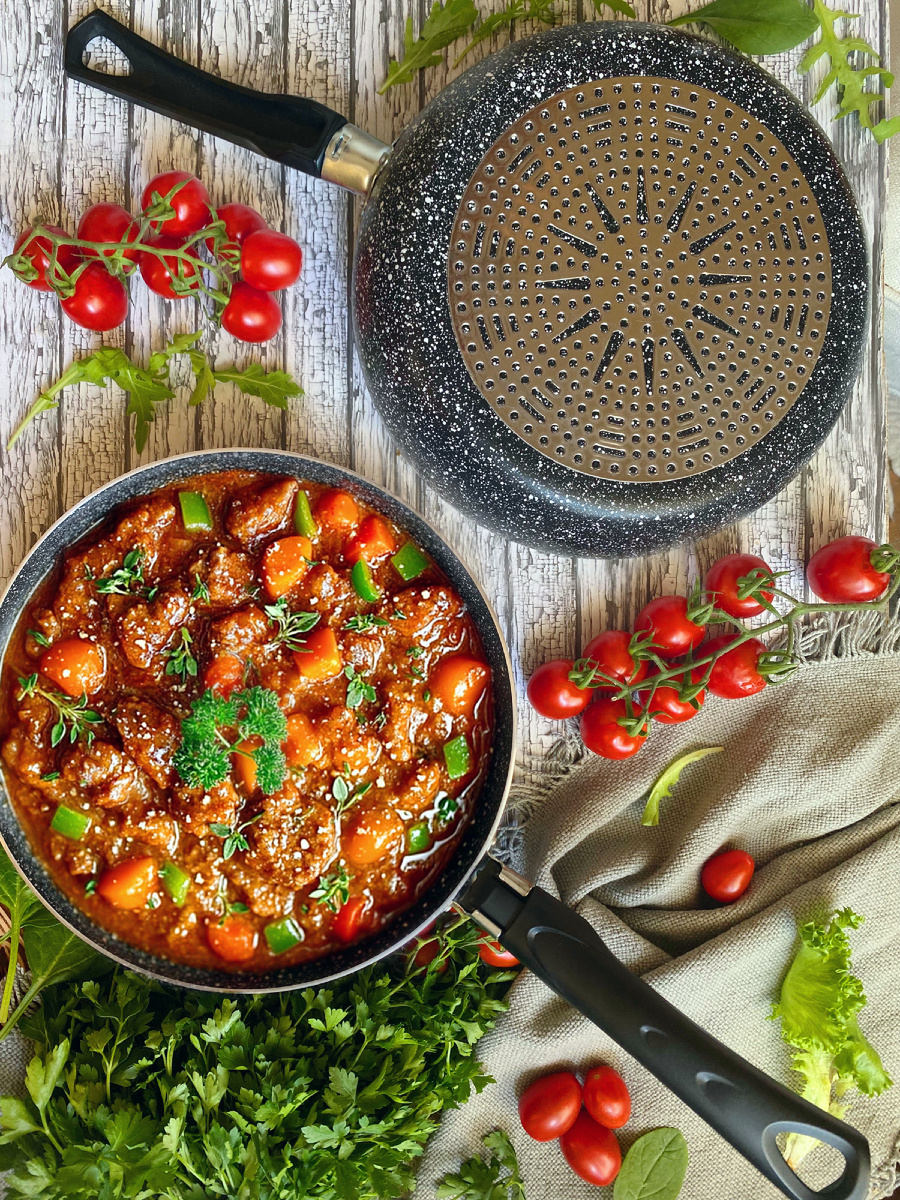 ▪️ В сотейнике нашей новейшей линейки EASY STONE INDUCTION хорошо разогреваем масло. Партиями обжариваем говядину 2–3 минуты до румяной корочки, чтобы не пускала лишний сок. Возвращаем всё мясо в сковороду.