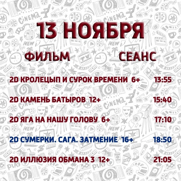 РЕПЕРТУАР НА 13 — 19 НОЯБРЯ На фильм «Сумерки. Сага. Затмение» брони и онлайн продажи нет, билет без указания места Стоимость билета на фильм «Сумерки. Сага. Затмение» — 300 рублей https://premierzal.ru/theatre/yashma/schedule Телефон для бронирования: 8 965 941 58 49 Бронь автоматически снимается за 20 минут до начала сеанса Касса кинотеатра открывается за 20 минут до начала первого сеанса и закрывается через 20 минут после начала последнего сеанса Источник https://uchaly102.ru/?p=110409