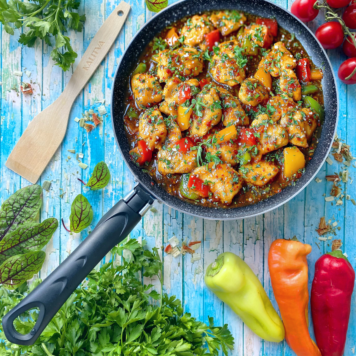 ▪️ В глубоком сотейнике линейки EASY STONE разогреваем масло. Партиями обжариваем курицу до лёгкой золотистой корочки, возвращаем весь мясной сок в сотейник