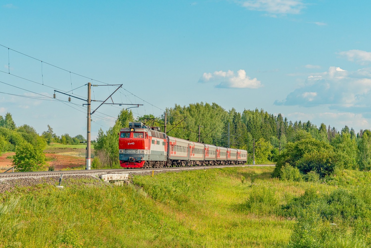 ЧС4Т-269 с пассажирским поездом солнечным летом летит в Киров, перегон Красносельский — Киров