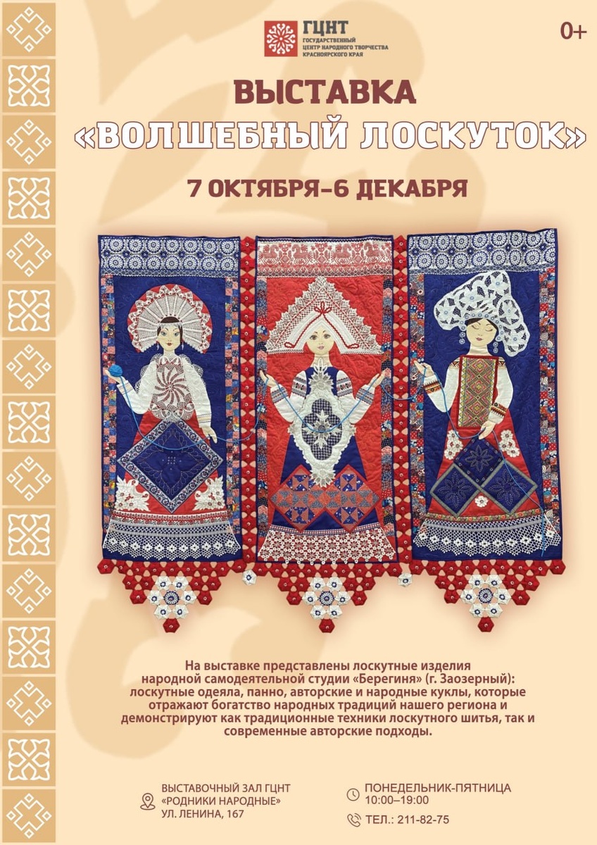 Приглашаем на выставку изделий народной самодеятельной студии «Берегиня» (г. Заозерный) «Волшебный лоскуток»! Народная самодеятельная студия «Берегиня» городского Дома культуры города Заозерного – филиал № 36 МБУК «ЦКС Рыбинского района» создана в 2007 году и объединяет 28 мастеров декоративно-прикладного и изобразительного искусства. Руководит студией её основатель – Кузьминых Татьяна Геннадьевна, заведующая сектором народного творчества городского Дома культуры города Заозерного, в 2023 году удостоенная специального звания «Мастер народных художественных ремёсел Красноярского края». На выставке представлено разнообразие лоскутных изделий: лоскутные одеяла, панно, авторские и народные куклы, которые отражают богатство народных традиций нашего региона и демонстрируют как традиционные техники лоскутного шитья, так и современные авторские подходы. Каждое изделие – это результат кропотливой работы и вдохновения мастера. Не упустите возможность погрузиться в мир «волшебных» лоскутков и
