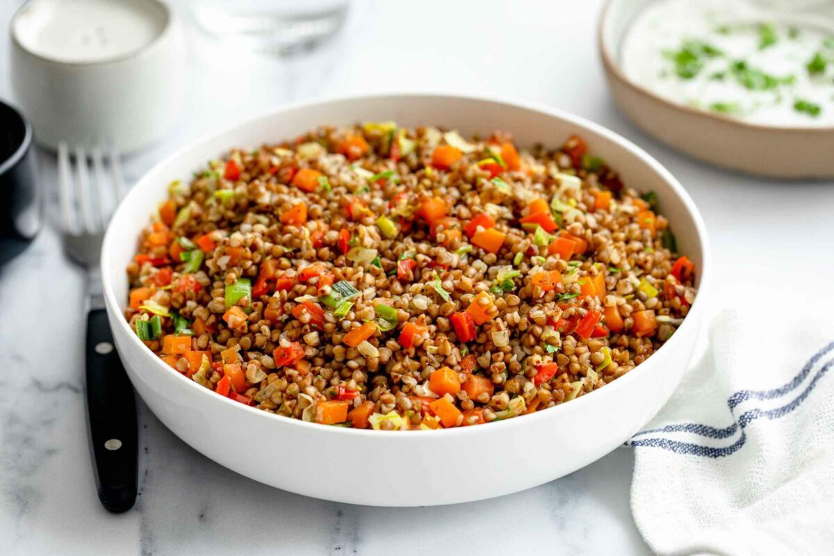 На среднем огне разогрейте сковороду с 1 ст. л. масла. Лук и морковь нарежьте мелко, перец кубиками. Обжарьте 3–4 минуты до мягкости, в конце добавьте чеснок на 20–30 секунд 2 - «подрумянить» гречку.