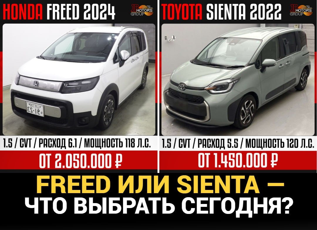 Два народных автомобиля из Японии — в новых кузовах и каждый по-своему интересен! Разберём каждую модель и минимальную цену. Honda Freed в новом кузове выпускается с 2024 года, поэтому её можно завезти как не проходную, так же на физическое лицо и с утильсбором — 5 200. В 2027 году этот кузов станет проходным! Toyota Sienta в новом кузове выпускается с 2022 года, поэтому её можно завезти как проходную, и стоимость будет ниже, чем у Freed. Оба автомобиля имеют примерно схожие параметры и характеристики. 🏎 HONDA FREED ▪️Дата выпуска - 2024 ▪️Двигатель - 1.5 / бензин ▪️Привод - 2WD / передний ▪️Л.с. - 118 л.с ▪️Вариатор ▪️Комплектация - "EX" 🚗Цена с аукционов Японии под ключ до Владивостока начинается: от 2.050.000 ₽ (базовая комплектация) 🏎 TOYOTA SIENTA ▪️Дата выпуска - 2024 ▪️Двигатель - 1.5 / бензин ▪️Привод - 2WD / передний ▪️Л.с. - 120 л.с ▪️Вариатор ▪️Комплектация - "X" 🚗Цена с аукционов Японии под ключ до Владивостока начинается: от 1.450.000 ₽ (за низкую аукционную оц