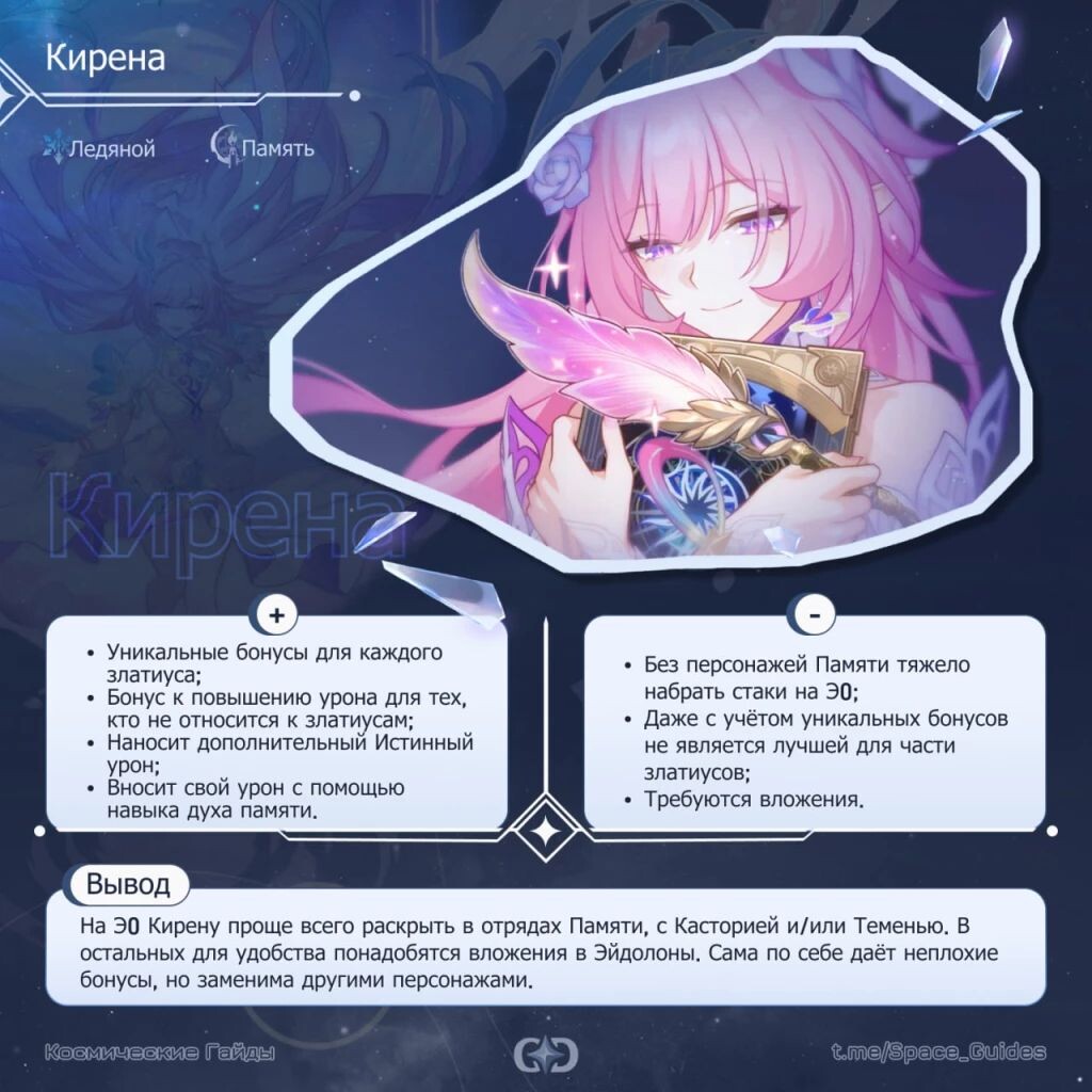 ㅤКирена — новый персонаж Пути Памяти, которая плавно внедрялась в историю и раскрывалась на протяжении всех версий 3.Х. Несмотря на её важность в сюжете и уникальный вид скилсета, её нельзя назвать необходимой для аккаунта, но обо всём по порядку.