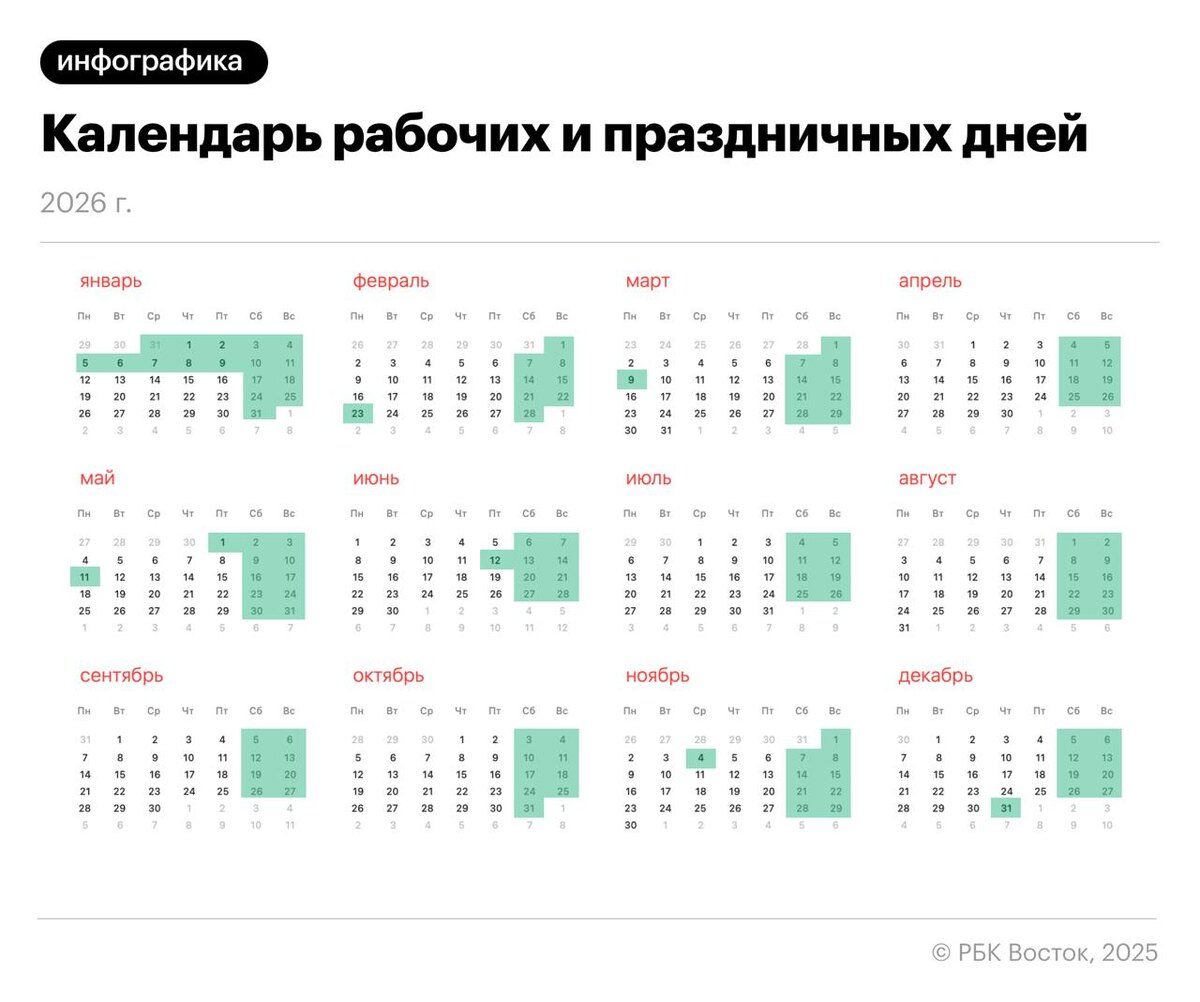 ❗️Минтруд России представил проект производственного календаря на 2026 год Нерабочими днями в следующем году станут: 🔹новогодние каникулы: 12 дней с 31 декабря по 11 января; 🔹февральские выходные: 3 дня с 21 по 23 февраля в честь Дня защитника Отечества; 🔹мартовские праздники: 3 дня с 7 по 9 марта для празднования Международного женского дня; 🔹майские каникулы: две серии выходных — с 1 по 3 мая и с 9 по 11 мая; 🔹июньские выходные: 3 дня с 12 по 14 июня в связи с Днем России; 🔹день народного единства: 4 ноября, который выпадает на среду. Решение о перемещении выходных, совпадающих с праздниками, принимает правительство каждый год. Цель такого переноса — обеспечить наиболее рациональное распределение рабочих периодов и отдыха, а также объединение праздничных дат с выходными днями там, где это возможно. 😃Подписывайтесь на РБК Восток