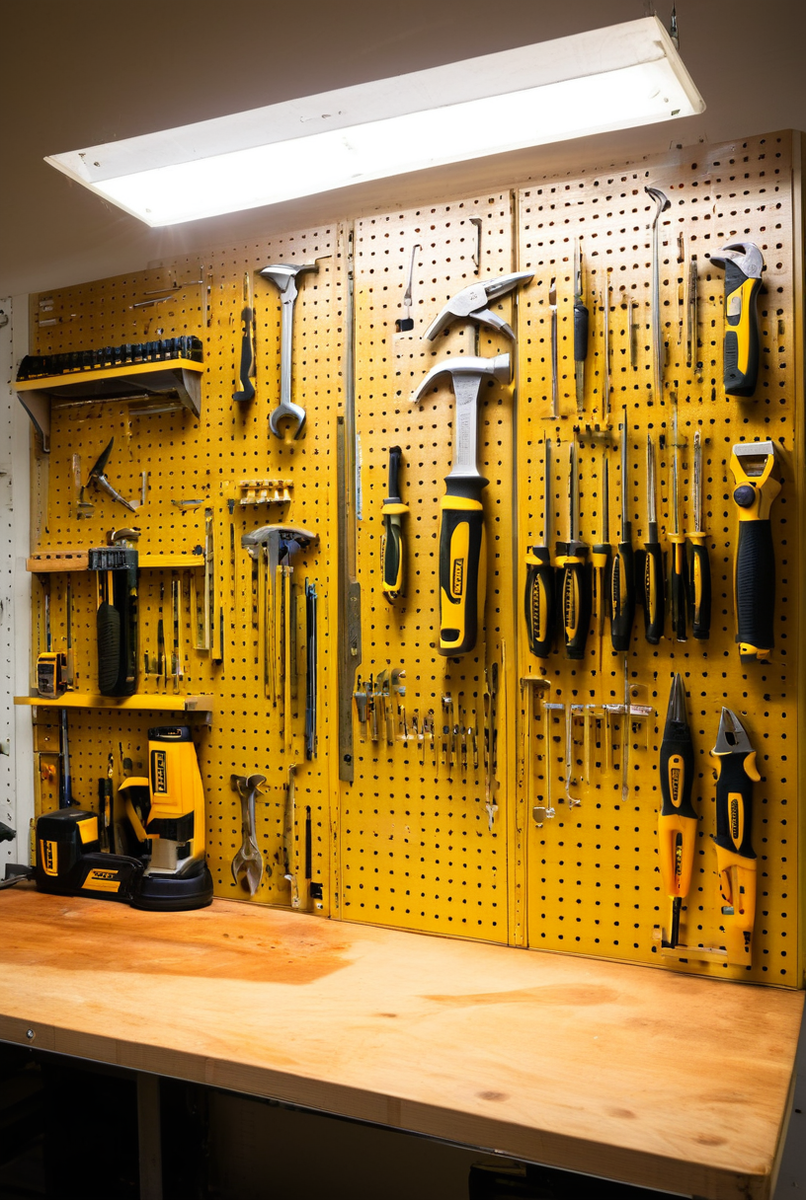 - Создайте рабочую зону: Определите место для верстака. Над ним выполните монтаж перфорированной панели (пегборд).