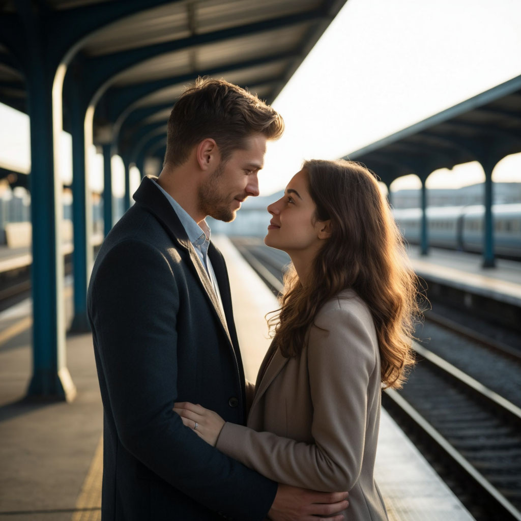 Ровно в 18:00 Соня стояла у входа в вокзал, нервно поглядывая на часы. Ветер играл её волосами, где‑то вдалеке гудел поезд.