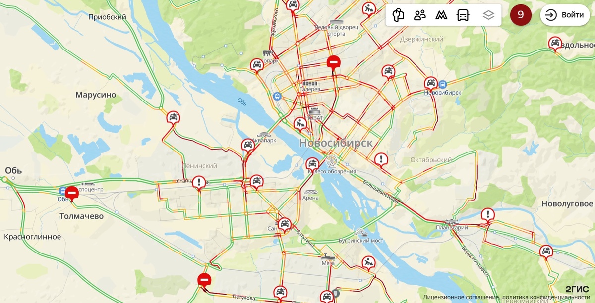 Ситуация в Новосибирске оценивается сервисами в 9 баллов. По данным дорожных карт, движение затруднено на подъездах к мостам, также бардовым цветом на карте 2GIS помечены улицы: Ипподромская, Фрунзе, Богдана Хмельницкого, Волочаевская, Гоголя, проезд Энергетиков. Причиной стали ночной мокрый снег и гололёд: разгон и торможение стали длиннее, участились мелкие столкновения. Синоптики вчера предупреждали о предстоящей метели. К 9 часам утра интенсивность заторов местами доходила до 10 баллов по классике — на основных выездах и развязках. Водителей просят планировать маршрут с запасом времени, держать дистанцию, избегать резких манёвров и по возможности переносить поездки вне часов пик. Пешеходам рекомендуют быть внимательнее на переходах — из-за наледи путь машин до полного остановления увеличен. Впрочем, накануне вечером, 11 ноября, Новосибирск также стоял колом в девятибалльных пробках. Заторы фиксировались всё там же — центре города, на подъездах к мостам и рядом прилегающих улицах. И