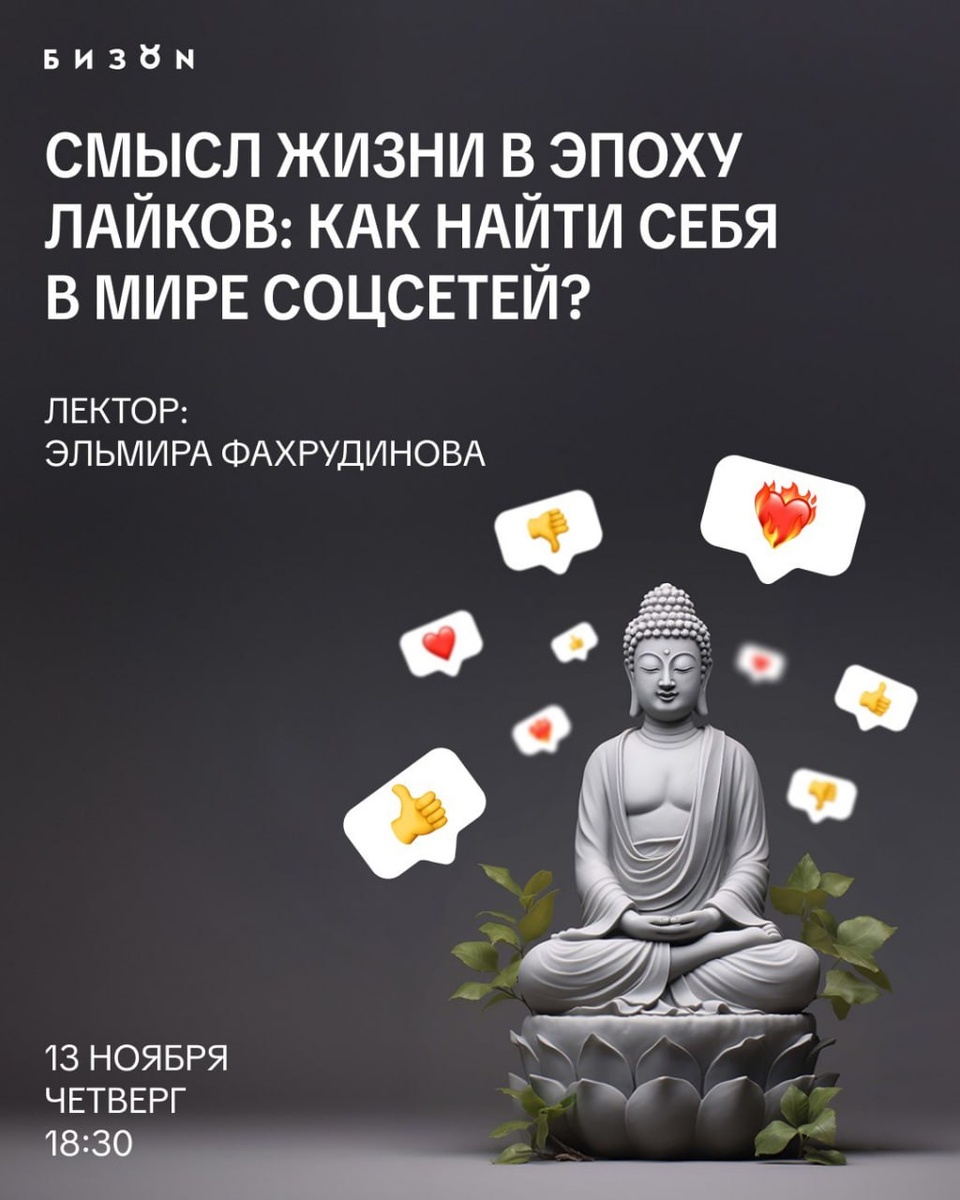 Лекция «Смысл жизни в эпоху лайков: как найти себя в мире соцсетей?» Сегодня лайки, подписчики и количество просмотров кажутся многим людям показателями успеха и значимости. Социальные сети создали эмоциональную зависимость от одобрения и сформировали новую культуру взаимодействия. В этом контексте возникает вопрос: как цифровые показатели влияют на внутренний мир человека и его ценности? Эльмира Фахрудинова расскажет о классических и современных идеях о том, что такое смысл жизни и как он формируется. Вместе со спикером слушатели смогут проанализировать разницу между внутренним смыслом и его внешними проявлениями. 🕕 13 ноября в 18:30 📍 Галерея БИЗОN 🎫 Билеты по ссылке