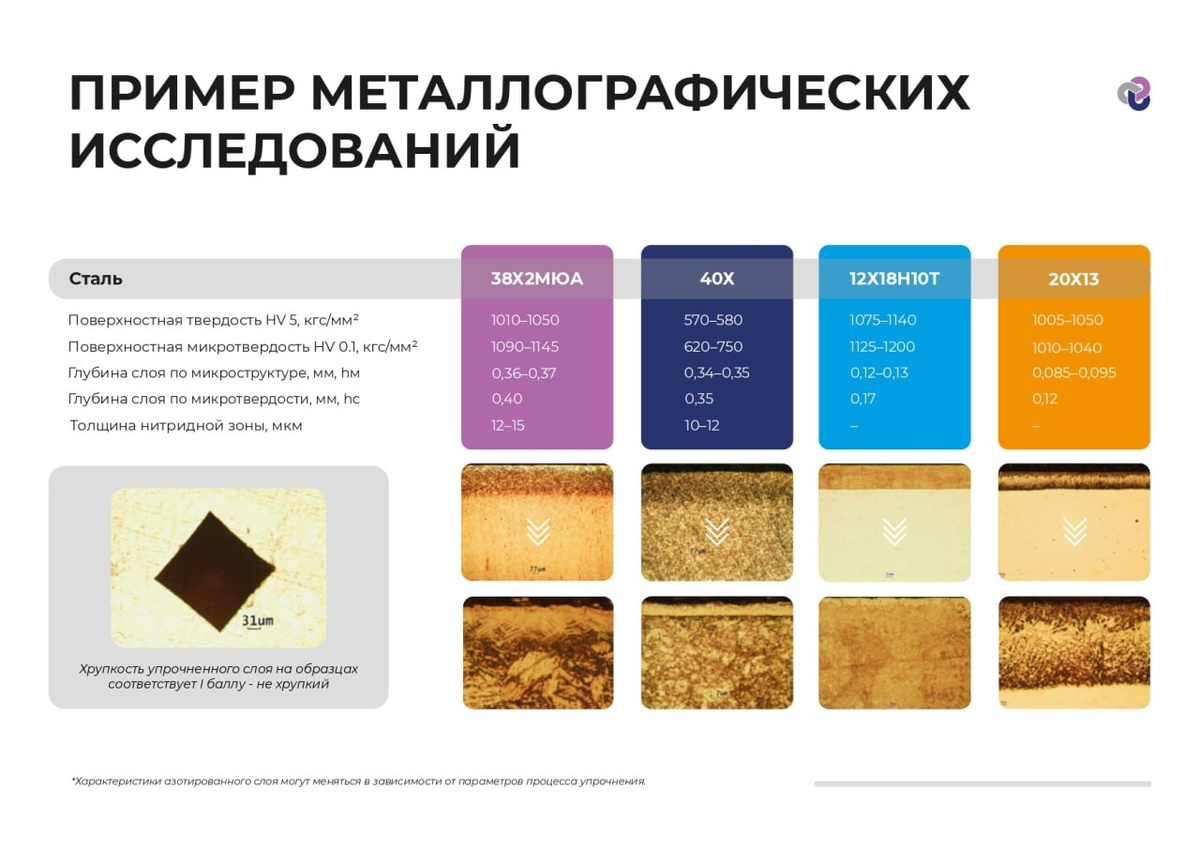 Наша лаборатория ежедневного проводит исследования диффузионных слоев, полученных методом ионного азотирования. Увеличение поверхностной твёрдости в 2+ раз. Рост твёрдости приводит к повышению износостойкости — сопротивление абразивному и адгезионному износу возрастает в 3–5 раз и как следствие срок службы повышается в несколько раз. Поэтому метод ионного азотирования на сегодняшний день является востребованным! Обратите внимание, что на разных классах стали структура и характер распределения твердости отличаются. Какие примеры вам интересны еще? #38Х2МЮА, #40Х #12Х18Н10Т #20Х13 #исследования