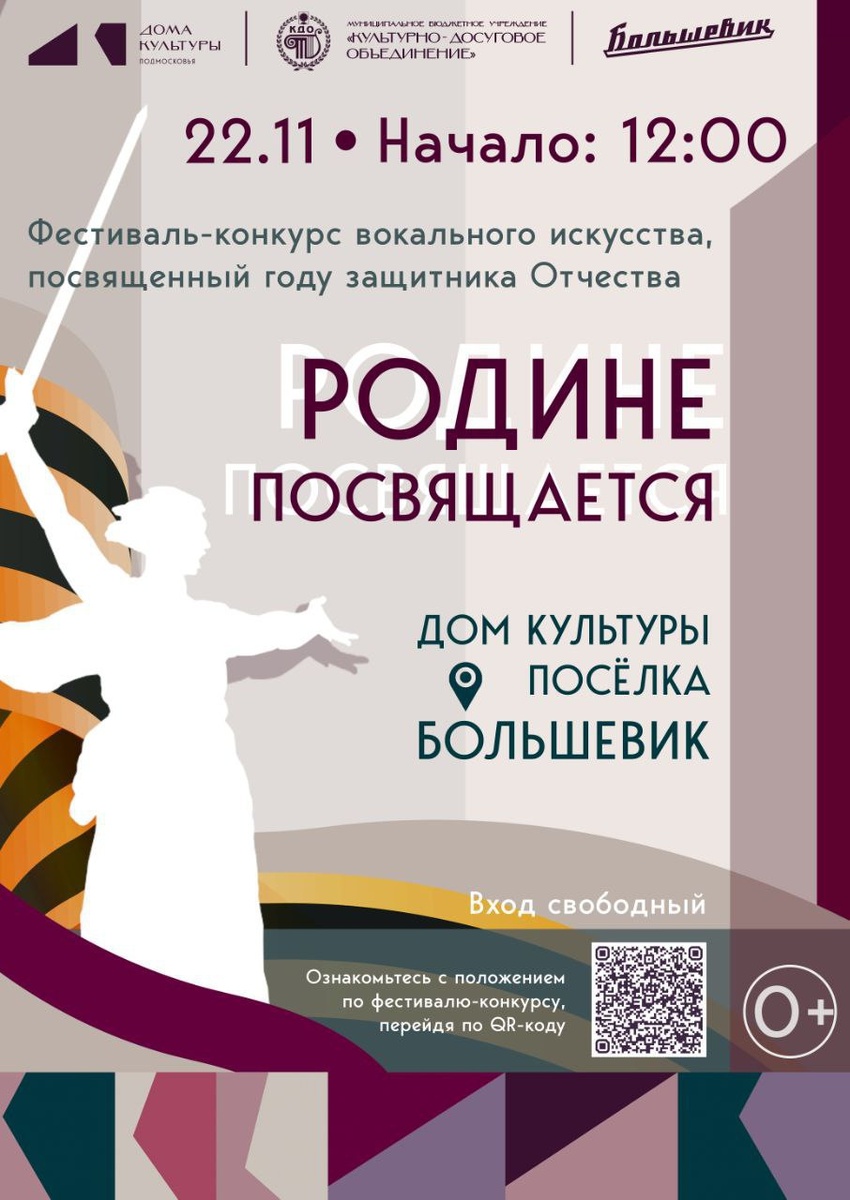 ✨ Бесплатный фестиваль-конкурс вокального искусства «Родине посвящается» 📋Тема песен: о войне, России, родном крае. 🎤Три номинации народный, эстрадный и академический вокал. 🚫Возраст 5+ 🔥Профессиональное жюри. ✍️Заявки на участие принимаются до 14 ноября по электронной почте: konkurs-serpreg@yandex.ru. 💫Конкурс бесплатный и вход на конкурс также бесплатный. 📆 22.11.2025 🕒 12:00 🏢 ДК "Большевик" 📍 г.о. Серпухов, пос. Большевик, ул. Спортивная, д.13 💰 Вход свободный❗️ ⭐Поддержать канал голосом 💰 Вакансия - курьер в Серпухове ✅ Мероприятия Серпухов https://dzen.ru/id/66f01c6eb4c6fe60c9ca1608 http://vk.com/serpukhov_events http://dzen.ru/serpukhov_events