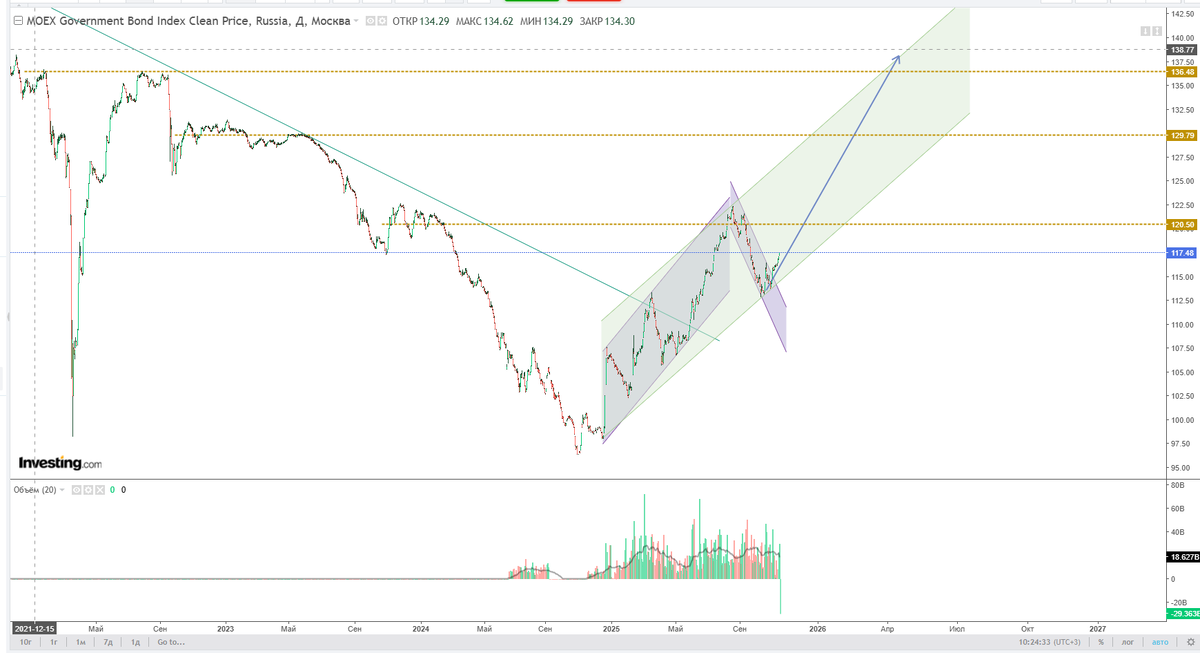 Предполагаемое повторение обозначено синей стрелой. Оно приводит нас к апрелю-июню 2026г и к уровню 137 (уже имеющемуся в истории RGBI).