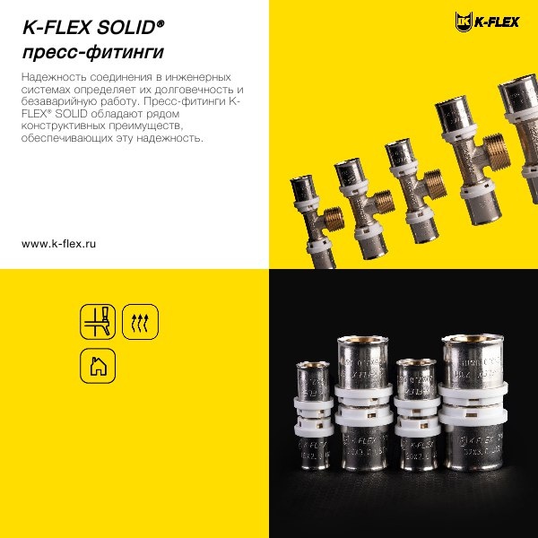Преимущества пресс-фитингов K-FLEX® SOLID Надежность соединения в инженерных системах определяет их долговечность и безаварийную работу. Пресс-фитинги K-FLEX® SOLID обладают рядом конструктивных преимуществ, обеспечивающих эту надежность. Ключевые особенности фитингов: Корпус из латуни марки CW617N/CW614N, устойчивый к коррозии. Обжимная гильза из нержавеющей стали AISI 304. Диэлектрическая тефлоновая вставка, исключающая гальваническую коррозию между алюминиевым слоем трубы и латунным фитингом. Уплотнительные кольца из EPDM резины, рассчитанные на высокие температуры. Специальное отверстие в гильзе для визуального контроля правильности посадки трубы. Фитинги рассчитаны на рабочую температуру до +95 °C и давление 10 бар, что позволяет использовать их в системах отопления и горячего водоснабжения. #KFLEX #Фитинги #Надежность #ИнженерныеСистемы #Сантехника #Отопление #Водоснабжение