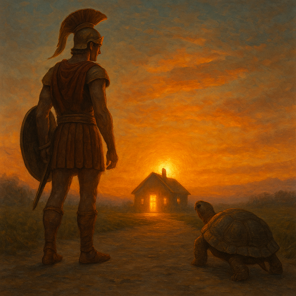 — Тогда ты перестаёшь бежать. Потому что дом не догоняют — в него возвращаются. Ахилл никогда не догонит черепаху —
