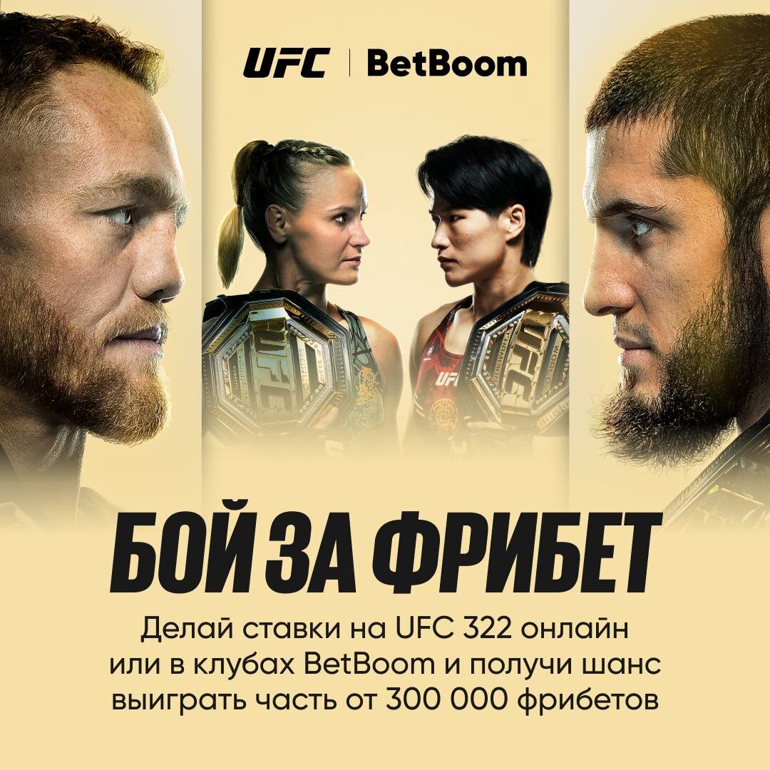 ❤️ На этой неделе долгожданный UFC 322 – ребята из BetBoom в честь этого турнира подготовили крутую акцию 🔥 1️⃣ Переходи по ссылке и жми кнопку «Принять участие» 2️⃣ Сделай ставку на UFC 322 от 1 000 рублей с кэфом от 1.3 Акция также действует во всех клубах BetBoom 😉 ⏳ 17-го ноября подведём итоги и выберем 100 счастливчиков, которые получат по 3 000 фрибетов 🪙