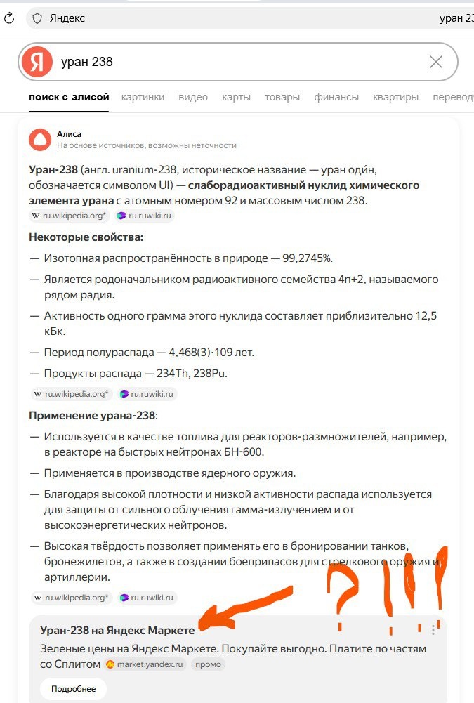 Здравствуйте, Друзья! Решил тут я набрать в поисковике один из самых известных природных изотопов Уран-238 (238U) и был ооочень удивлён когда увидел внизу окна что Уран-238 можно купить на Яндекс Маркете😳. Конечно не удержался и перешел на ЯМ. И вот что там оказалось 🤣 Всем хорошего дня 😍