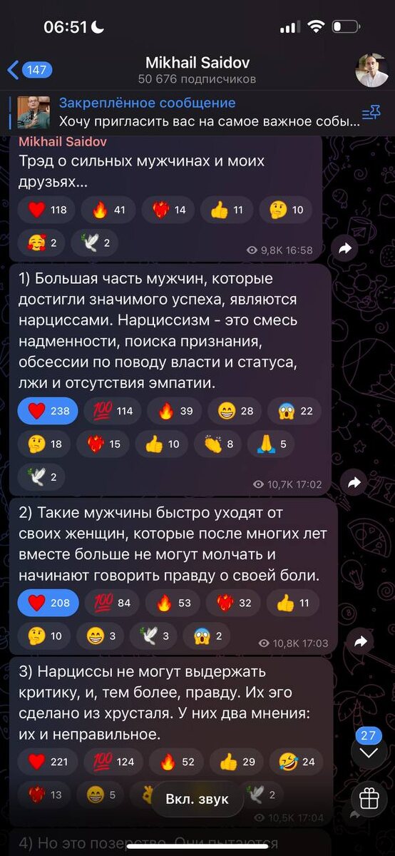 Я выбираю мужчин без амбиций Да, вы не ослышались — без. Не тех, кто «вижу цель — не вижу препятствий», а тех, кто видит человека. То есть меня. И умеет с ним обходиться. Или пока не умеет, но хочет учиться. Недавно подписчица спросила, какие качества объединяют моих партнёров. Я бодро ответила: доброта, гибкость, включённость, умение договариваться. А потом подумала — ни один из них не зарабатывал больше меня. Совпадение? Не думаю. Конечно, я тоже мечтаю, чтобы мужчина обеспечивал, дарил Баленсиагу и возил на Мальдивы. И чтобы создавала проекты «из любви», не просчитывая рентабельность, и искала себя. Но на практике почему-то выбираю не тех, про чьи достижения нужно слушать весь вечер, а тех, кто слушает меня. Дальше только мой личный опыт. Вы можете быть с ним не согласны, и я готова услышать ваш. Чтобы делать большие деньги, нужно кое-что особенное. Например: — низкая чувствительность к себе (иначе не протянешь в режиме «работа 24/7»); — минимальная эмпатия (иначе не выживешь в