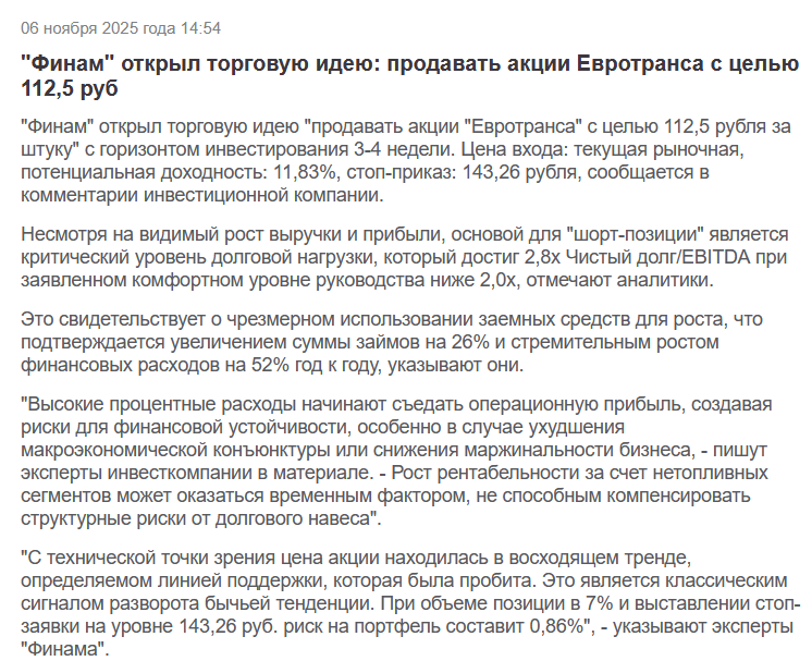 С одной стороны Финам говорит, что акции Евротранса нужно продавать: