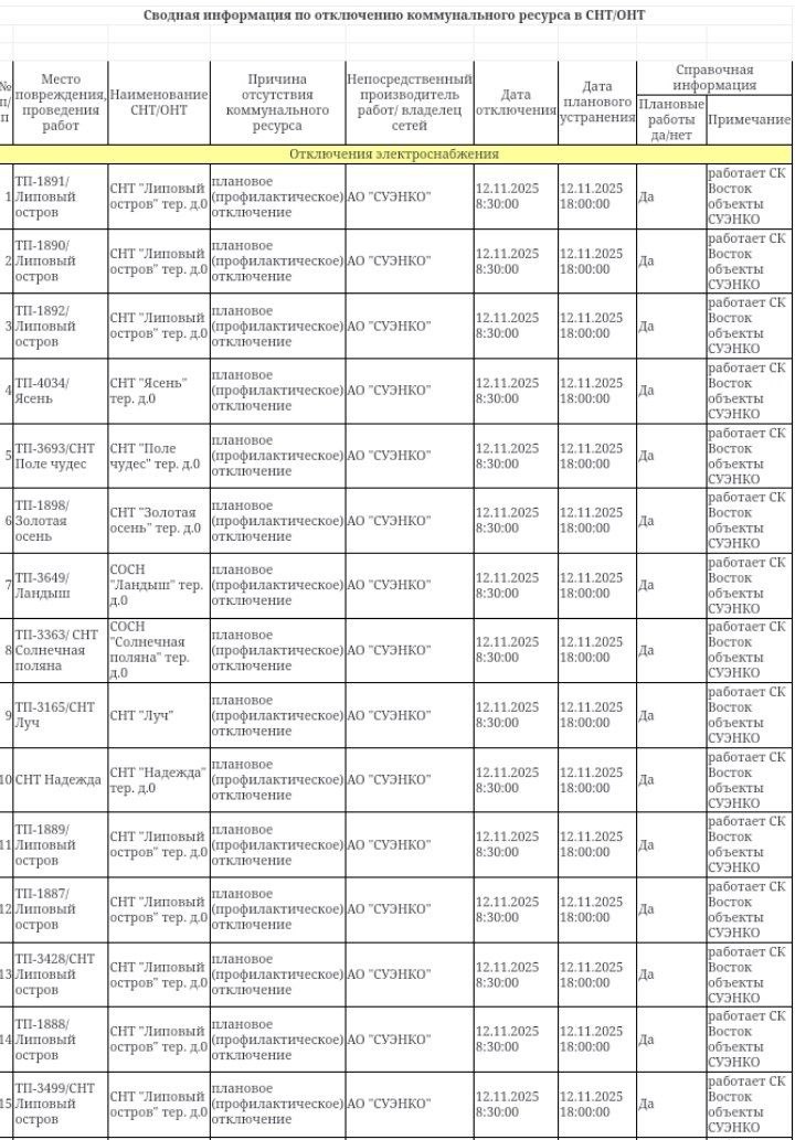Информация по плановым отключениям в СНТ/ДНТ на 12.11.2025 от ЕДДС города Тюмени