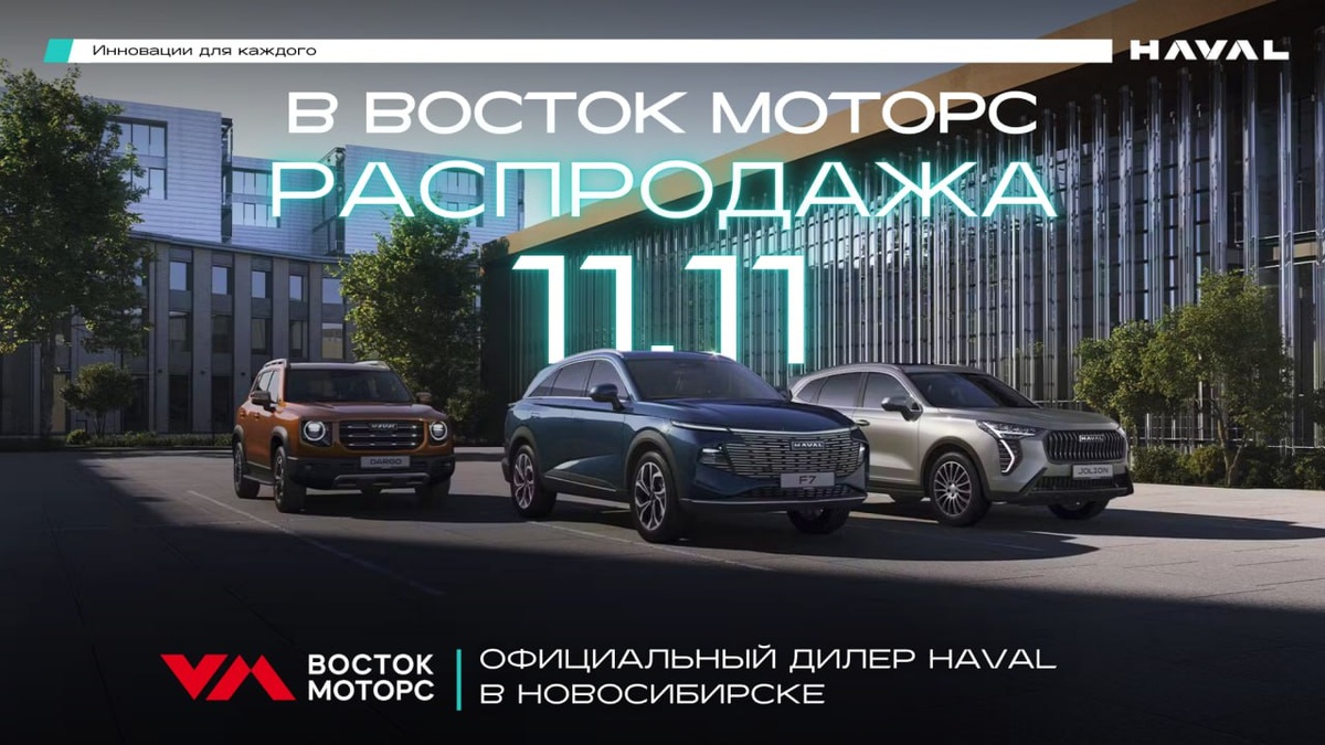🎉 Распродажа 11.11? В Восток Моторс она длится целую неделю - максимум выгода на HAVAL! В Восток Моторс распродажа 11.11 длится не один день, а до 16 ноября! Это ваша неделя, чтобы выбрать надёжный, тёплый и выгодный кроссовер HAVAL и не переплачивать потом. • Рассрочка от 0,01% до 4 лет¹, комфортный платёж от 15к ₽/мес.¹, действующая госпрограмма для льготных категорий. • Зачтём ваш старый авто по TRADE-IN и подберём оптимальные условия. ❄️ Зима уже близко - оформляйте HAVAL по условиям недели 11.11! 📞 Запишитесь на тест-драйв в Восток Моторс: +7(383)205-15-34 📍 Мы ждём вас на Большевистской, 276/2 (рядом с карьером Борок) 🌐 Подробности на сайте: haval-promo-nsk.ru ¹ Информация не является публичной офертой, полные условия на сайте. Изучите все условия кредита (займа) в соответствующем разделе. Оценивайте свои финансовые возможности и риски. Финансовые услуги оказывает: АО "ТБанк". ООО "ВМ-Н-АЗИЯ" ИНН: 5405080130 2Vtzqv2CxYp