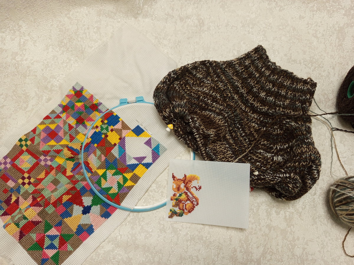 Я - прогульщица! На прошлой неделе не было отчета, помню, что была сильно занята в начале недели, а вот чем вообще не помню. А писать отчет к пятнице вроде и смысла нет... Итак, приступим. В прошлом отчете было так. Все процессы немножечко подвигались. Подушка стала прирастать треугольниками, и скоро блок будет готов. Но случилось непредвиденное, у меня сломались пальцы, да китайские, да дешевые, но все равно обидно. Платье тоже потихоньку растет, завершила второй этап ломаного реглана. А вот белка совсем выросла. И преобразилась. Так что готова моя белочка. Очень хочу сапожки, а вот успею ли закончить осенью.... И общее фото на память. Вот такие мои продвижения случились.