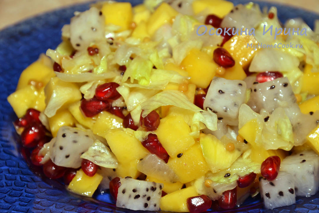 Фруктовые салаты вещь весьма полезная, они источник антиоксидантов, замедляющих процессы старения, поддерживают водный баланс в организме, витаминизируют, дают энергию и радуют рецепторы. Сегодня у меня такой: порезала кубиками 1 питахайю и 1 манго, добавила 1/4 резаного довольно мелко кочанчика салата "Айсберг" и зёрна половины граната. В пиалке смешала 2 ст.л. оливкового масла, 1 ч.л. с верхом зернистой горчицы, 1 ч.л. жидкого мёда и 1 дес.л. лимонного сока, подвзбила до состояния эмульсии, заправила салат и сразу подала. Простой, незатейливый и очень вкусный салатик) Приятного аппетита