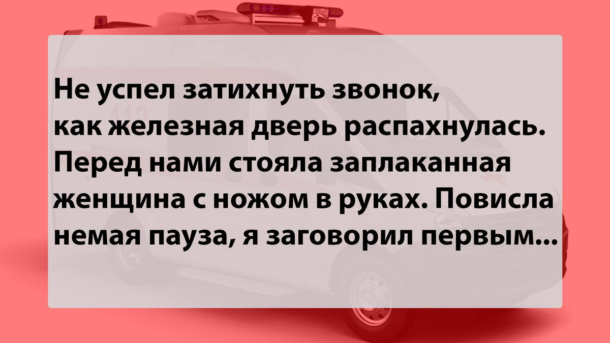 Воскресенье, 7:20 утра. Суточное дежурство подходит к концу и, все, чего сейчас хочется - как можно скорее попасть домой. Но до конца смены еще полтора часа, поэтому придется немного подождать. Несмотря на выходной, после небольшого перерыва все бригады разъехались кто куда. Досталось и нам. Повод к вызову: «Мужчина избивает женщину. Кричит, просит о помощи. Вызывает соседка». Под конец смены «лучшего» не придумать: кто знает, сколько мы там провозимся и чем все закончится. Но выбора нет, поэтому собираемся и едем по указанному адресу. Минут через десять водитель остановил Газель возле одной из панельных пятиэтажек нашего города. - Ну что, пойдем, - сказал я Маше, фельдшеру бригады. - А мы полицию разве ждать не будем? - спросила она. - Пойдем поговорим с теми, кто вызывал, а там и наряд должен подъехать. - Ну пошли, только геройствовать я не буду, - ответила девушка. - Мне один раз монтировкой чуть не заехали, больше не хочется. - Хорошо, не будем, - улыбнувшись, ответил я и набрал но