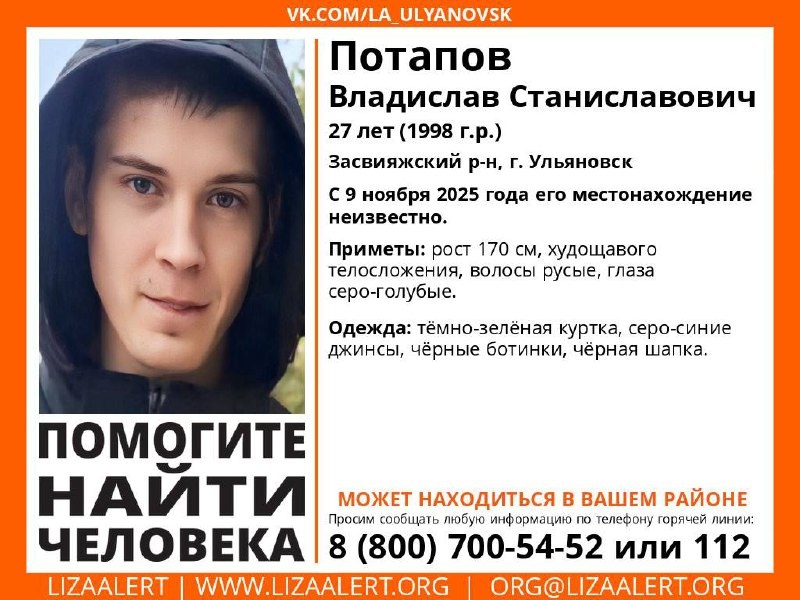 ❗️В Засвияжье третий день не могут найти молодого человека ПРОПАЛ: Потапов Владислав Станиславович, 27 лет (1998 г.р.) Дата пропажи: 9 ноября 2025 года. Место пропажи: Засвияжский р-н, г. Ульяновск. Приметы: рост 170 см, худощавого телосложения, волосы русые, глаза серо-голубые. Одежда: тёмно-зелёная куртка, серо-синие джинсы, чёрные ботинки, чёрная шапка. Инфорг: Горячая (Юлия), тел.: 89041814330 #ЛизаАлерт #Ульяновск #Пропал