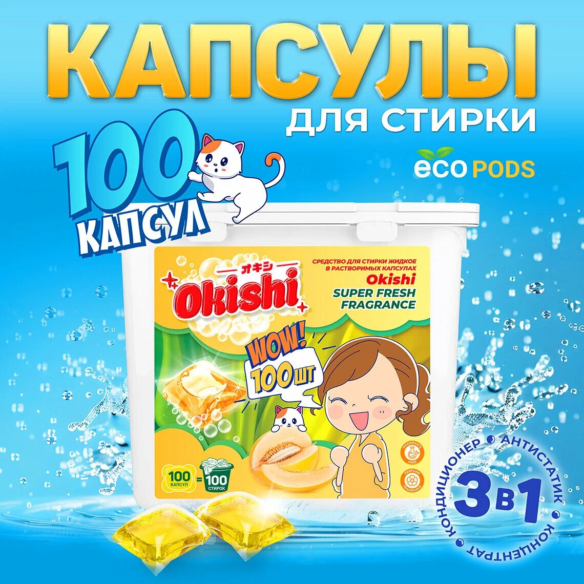Капсулы для ежедневной стирки Okishi с ароматом дыни — быстрый и эффективный способ держать бельё свежим без лишних хлопот. Упаковка на 100 штук — это запас на много дней, который освободит вас от подсчёта доз и лишних бутылок с жидкостью.