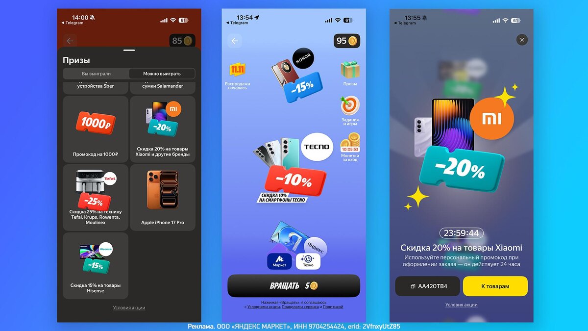 Хотите выиграть топовую технику? «Яндекс Маркет» запустил «Колесо Призов» ТЕХНО — можно выиграть умные устройства «Яндекс» с «Алисой», iPhone 17 Pro Max, PlayStation 5 и поймать скидки до 20% на технику брендов-партнёров. Что нужно делать? 🔹 Заходите в приложение «Яндекс Маркет», выбираете вкладку «Колесо Призов» — нужно синее, с техно-призами; 🔹 Крутить колесо можно каждый день — за монетки, которые дают просто за вход и покупки на «Яндекс Маркете». Скорее переходите по ссылке и испытывайте свою удачу!