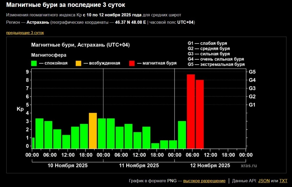 В Астраханской области сегодня наблюдается мощнейшая магнитная буря уровня G4–G5