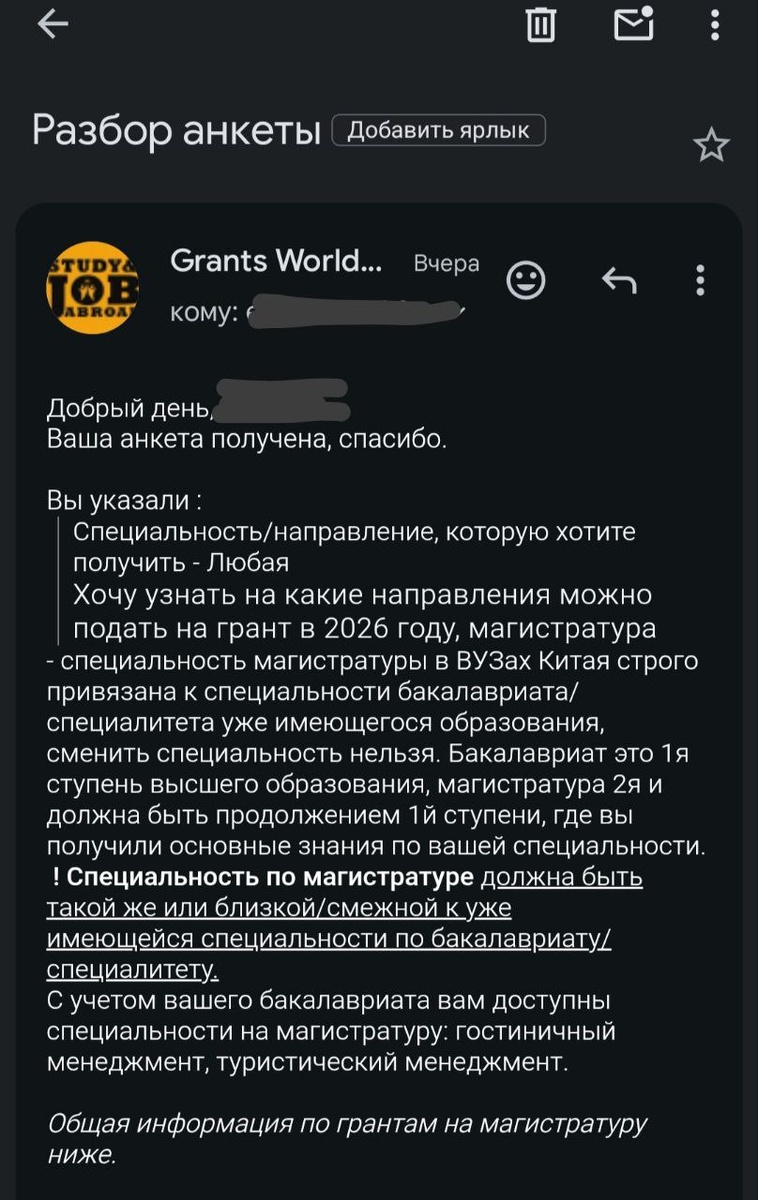 ❓Как выбрать специальность на магистратуру? #магистратуракитай При заполнении анкеты часто указываете, что готовы рассмотреть любую специальность для магистратуры или указываете нужную, но не связанную с вашим бакалавриатом / специалитетом 🧐— Ну, а что такого? Был гуманитарий, выучил язык, а теперь хочу стать магистром архитектуры или экономики НЕТ — в университетах Китая, да и остального мира (кроме, видимо, России) так нельзя. Ведь бакалавриат это 1я ступень высшего образования, а магистратура 2я ступень и должна быть продолжением 1й ступени, где вы получили основные знания по вашей специальности. 📍Специальность по магистратуре должна быть такой же или близкой/смежной к уже имеющейся специальности по бакалавриату/специалитету. Это правило во всех, даже очень небольших ВУЗах и обойти его нельзя никак Если нужны примеры по конкретным специальностям ставьте🔥 ✍🏻 Заполняйте АНКЕТУ / ССЫЛКА / — и получайте грант магистратуры в 2026 с нами🍀 Прием на гранты магистратуры уже идет