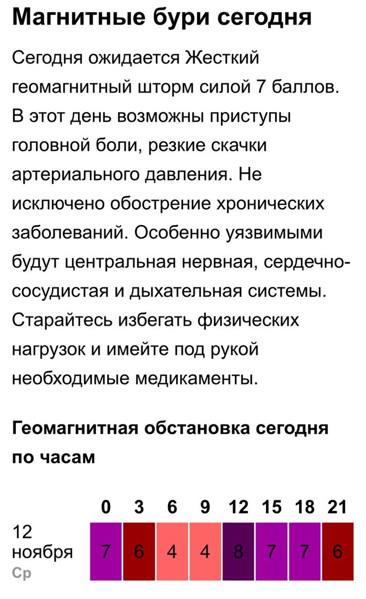 ☄️🤯🤕МЕТЕОРУБРИКА😰🌪️ СРОЧНО В НОМЕР! «Держите свои болты и гайки»©️, дорожайшие мои метеочувствительнве визави! Нас накрыло настоящим геомагнитным штормом! 8 баллов из 8!!! Что происходит вообще? То-то со мной котик спал в обнимку под мышкой всю ночь, чего отродясь не было. Муж в отличие от нас с Гриней вообще совсем не спал. Я проснулась в 5.10. А младшая дочь с утра мучается тошнотой с головогудением. Уф((( главное, что с этой «подводной лодки» никому из нас с вами не деться. Так что настаиваю — • Пейте больше воды и избегайте алкоголя! • Проветривайте помещение, отдыхайте. • По-возможности гуляйте постепенно и откажитесь от физических нагрузок! • И принимайте лекарства, назначенные врачом!!! БЕРЕГИТЕ СЕБЯ! Всех обняла!