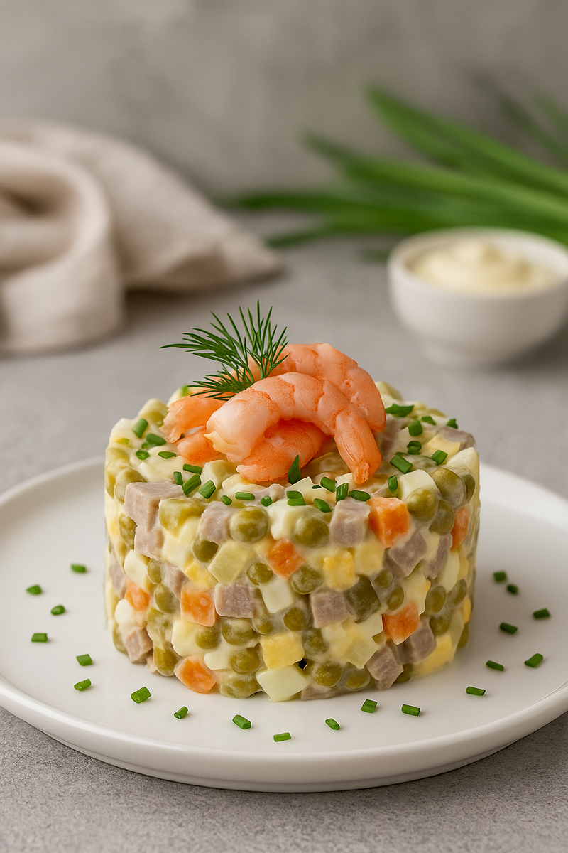 Новый год — время, когда даже те, кто редко готовит, достают фартук и идут на кухню. Без «Оливье» трудно представить праздничный стол. Но сегодня я хочу поделиться своим фирменным рецептом — «Оливье по-царски», который превращает привычный салат в настоящий кулинарный шедевр. В нём нет дешёвых заменителей и случайных ингредиентов — только продукты, достойные новогоднего стола. Почему именно «по-царски» Классический вариант «Оливье» давно стал народным, но изначально это было блюдо ресторанное, с дорогими деликатесами — раковыми шейками, каперсами, телятиной. Мой вариант — не копия старинного рецепта, а адаптированная версия, в которой сочетаются богатый вкус, доступные продукты и праздничная подача. Ингредиенты (на 6–8 порций) Отварное мясо (телятина или говядина) — 300 г Картофель — 4 шт. Морковь — 2 шт. Яйца куриные — 5 шт. Зелёный горошек (консервированный) — 1 банка (400 г) Соленые или маринованные огурцы — 3 шт. Отварные креветки или раковые шейки — 150 г Майонез домашний или п