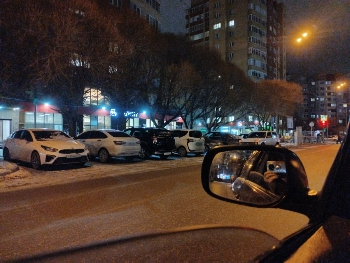 Парковка в это время занята, жители близлежащих домов еще не разъехались.