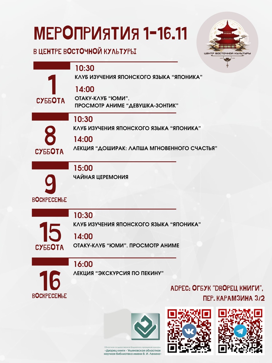 ☕️ Где можно посетить чайную церемонию, изучить новый язык и узнать о культуре стран Азии? ✨ Конечно же, в Центре восточной культуры Дворца книги! 🌸 Смотрим расписание мероприятий до 16 ноября! #ДворецКниги_афиша