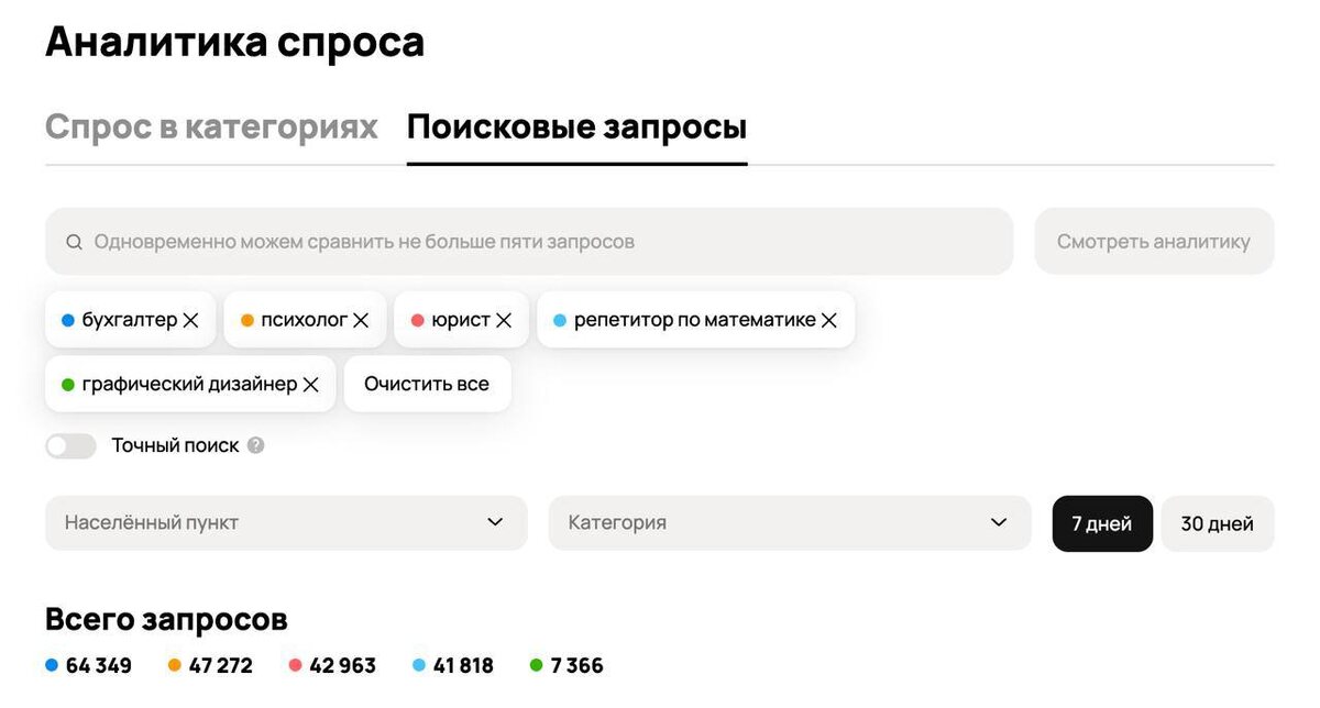 Авито – это площадка, где продают старье! И 3 года назад я бы с этим согласилась😅 ведь действительно, когда-то я продавала там старую видео-камеру мужа, десткое кресло и садовый участок. И даже это не продала😂 Однажды для меня ситуация именилась, я как говорится – уверовала. Мои клиенты на 80% приходят с Авито и избавляют меня от необходимости запариваться над регулярностью контента. Есть ресурс – веду, нет ресурса – откладываю и не переживаю, что через месяц будет нечего есть😅 Но речь сегодня не о моей вере! А от том чтобы подсветить аудитории – на Авито есть те кто ищет именно вас. И поможет мне аналитика спроса внутри площадки. Это инструмент, который цифрами отвечает на вопрос – сколько человек поискали услугу за 7. Для наглядности взяла усулги, которые оказываются онлайн и оффалйн. Итак, внимание! Смотрите скрины. По всей Росии: Бухгалтеров поискали 64 349 раз за 7 дней. Психологов – 47 272 раза. Юристов – 42 963 раз. Репититоров по математике – 41 818 раз. И графических д