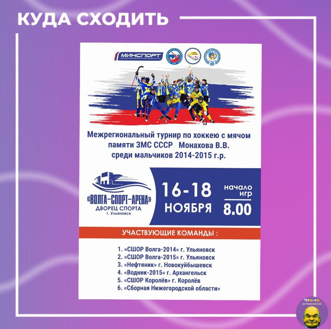 Межрегиональный турнир по хоккею с мячом🏑 Во Дворце спорта «Волга-Спорт-Арена» состоится Межрегиональный турнир по хоккею с мячом, памяти Заслуженного мастера спорта СССР Монахова В.В. В турнире примут участие команды мальчиков 2014–2015 годов рождения из разных регионов России: — Самарская область — Московская область — Нижегородская область — Архангельск — Ульяновск. 📅Когда: С 16 по 18 ноября 📍Где: Дворец спорта «Волга-Спорт-Арена» #куда_пойти_ул