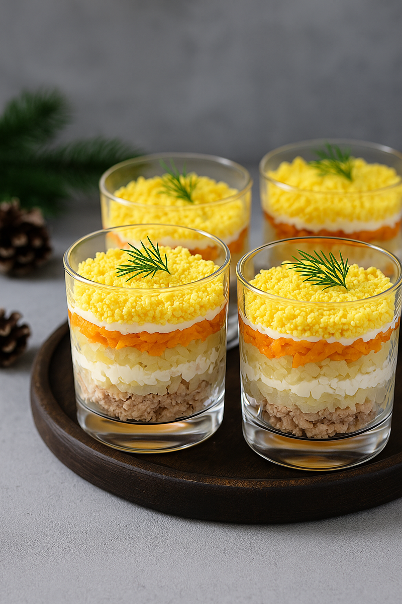 Салат «Мимоза» по-новому: как подать любимую классику в порционных стаканах и удивить гостей на Новый год