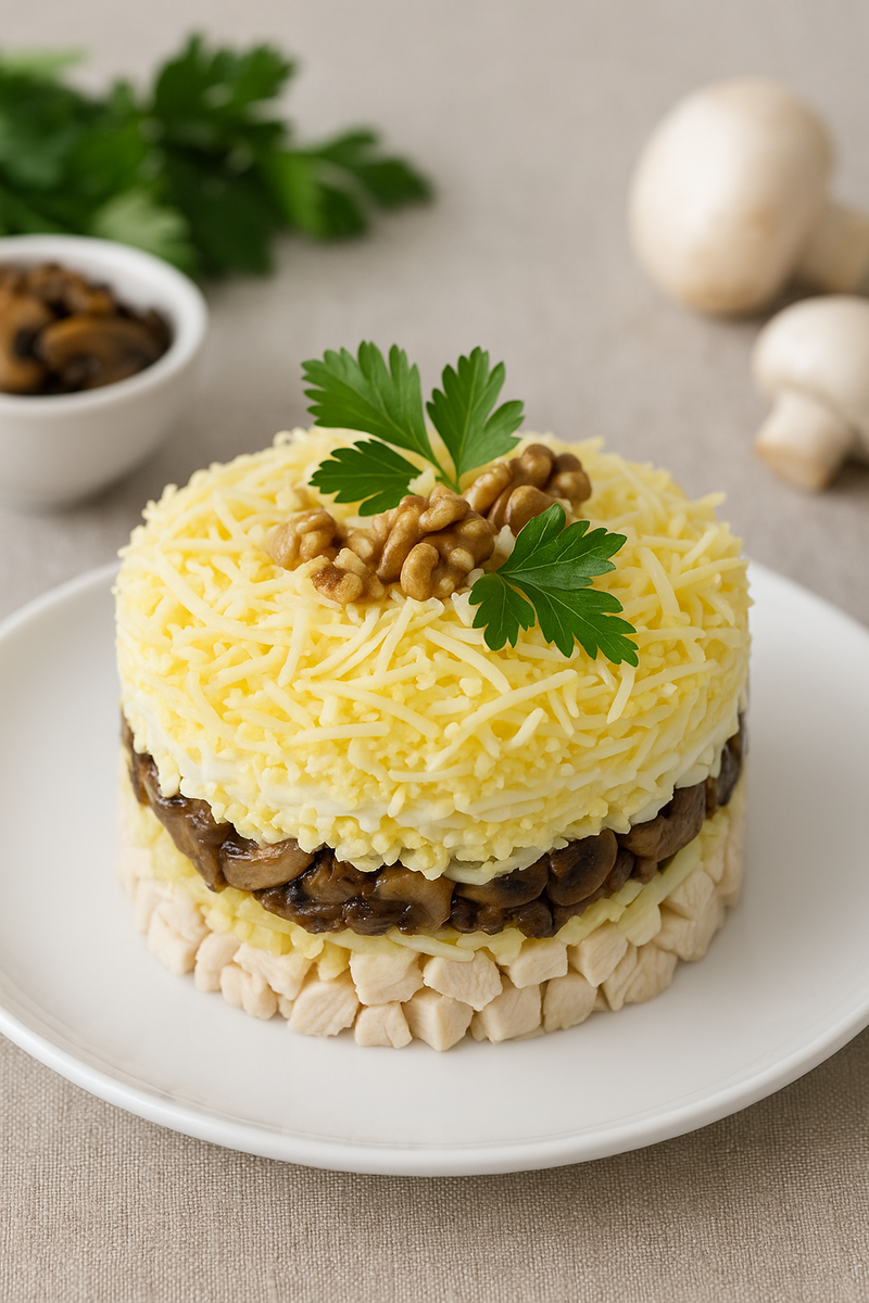 Новый год — повод удивить Каждый год мы ищем новые рецепты, чтобы праздничный стол выглядел не только красиво, но и вкусно. Сегодня хочу поделиться проверенным вариантом — салатом «Дамский каприз». Это блюдо всегда вызывает восторг у гостей: нежный, легкий, но с выразительным вкусом. Расскажу пошагово, как приготовить классический вариант и поделюсь секретами, чтобы получилось идеально с первого раза. Почему именно «Дамский каприз» Этот салат называют «дамским» не случайно: он изысканный, с мягким вкусом и без лишней тяжести. Его часто готовят на Новый год, потому что он отлично сочетается с другими праздничными блюдами и выглядит нарядно. Ингредиенты (на 4 порции) Основные продукты: Куриное филе — 300 г Яйца — 3 шт. Сыр твердый — 150 г Шампиньоны — 200 г Лук — 1 шт. Майонез — 150 г Соль — по вкусу Растительное масло — для жарки Дополнительно (по желанию): Грецкие орехи — 50 г Чеснок — 1 зубчик Зелень для украшения Этап 1. Подготовка ингредиентов Куриное филе отварите в подсоленно