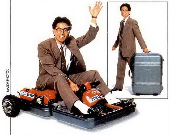 Пока собирал инфу про прошлый «чемодан на колесиках» наткнулся на еще один подобный аппарат. Кстати, наглядно демонстрирующий упомянутую в прошлой заметке японскую «манию миниатюризации». В 1991 году компания Mazda (в представлении, кмк, не нуждается) провела среди сотрудников конкурс «на самое креативное транспортное средство». Победителем стал молодой инженер Йошими Канемото, собравший… правильно, очередной «самобеглый чемодан» Suitcase Car. По словам Йошими, идея пришла к нему в аэропорту, когда он стоял в длинной очереди к стоянке такси. Аппарат по сути представлял собой урезанный до самых базовых узлов трицикл, упиханный в самый обычный чемодан. Трансформация занимала меньше минуты - требовалось только зафиксировать обе створки чемодана, вынуть заглушку под переднее колесо, вставить съемные задние колеса в полые оси, наклонить и закрепить "рулевую колонку" и поставить на свое место маленькие фары и сиденье (оно же - бензобак). В движение транспортное средство приводилось одноцили