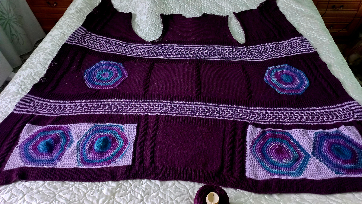 Привет, друзья! Сегодня хочу поделиться с вами прогрессом моего нового проекта — кардигана "Чароит". Это изделие движется медленно, но верно, и я рада, что наконец-то вернулась к его созданию благодаря проекту "Год кардиганов". Всё началось прошлым летом, когда я решила связать кардиган из 100% кардного мериноса. Но, к сожалению, из-за жары и других проектов работа над ним была отложена. Кардный меринос — это пушистый, лёгкий и тёплый материал, который идеально подходит для объёмных изделий. Однако, его вязание требует особого внимания и терпения, особенно в летний период. Основной нитью для кардигана стал кардный меринос. Это волокно, которое скручивается без последующего вычёсывания, что придаёт ему характерный пушистый и матовый вид. Вставки связаны крючком из пряжи Ализе Супервош комфорт — это остатки от моих носков, которые идеально вписались в общую концепцию. Жаккардовые полосы сделаны из кашемира и мохера. Эти материалы также являются остатками от другого проекта — "Сиреневый т