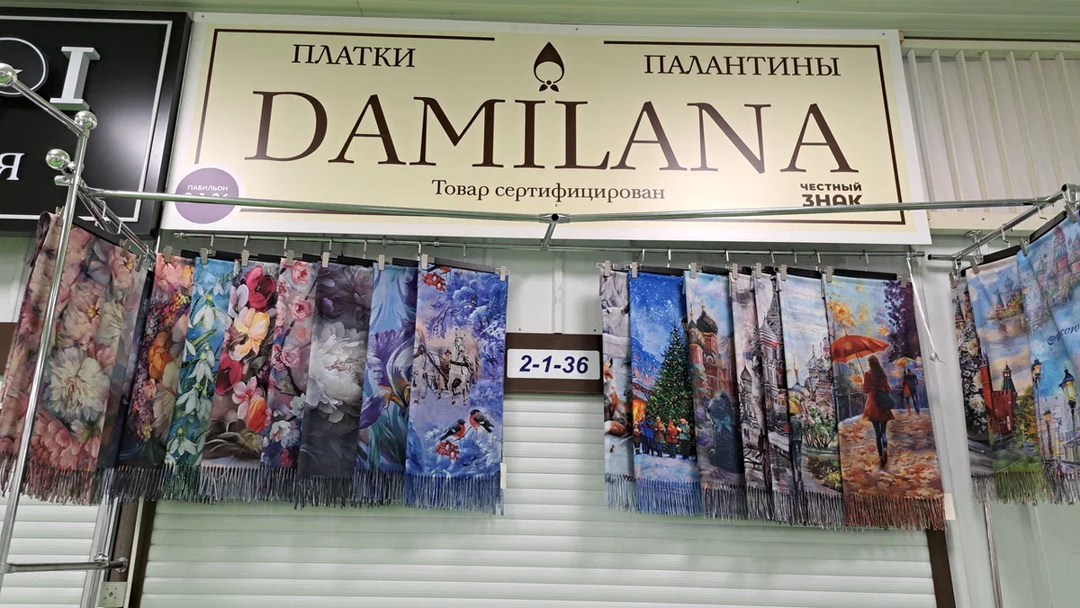 Тут продают палантины, несколько штук забыли убрать на ночь или просто не захотели, интересные расцветки, как картины.