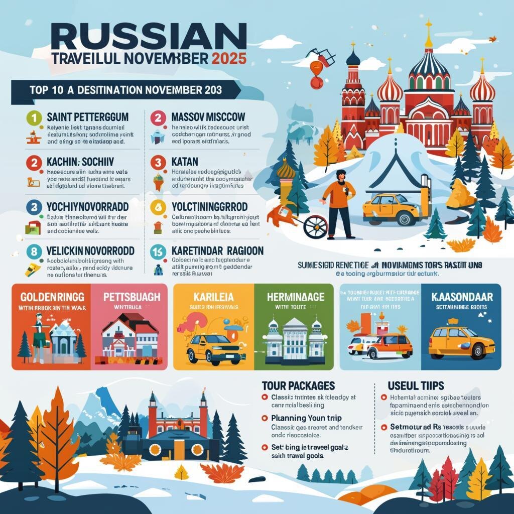 Путешествие по России в ноябре открывает уникальные возможности для изучения богатого культурного наследия, природных красот и исторических мест нашей страны. Давайте рассмотрим наиболее привлекательные направления и маршруты, актуальные в 2025 году. 1 Санкт-Петербург Музеи, архитектура, театры 2 Москва Столичные достопримечательности 3 Казань Национальная культура и кухня 4 Сочи Мягкий климат и горнолыжные курорты 5 Калининград Европейская атмосфера и история 6 Золотое кольцо Русская старина и деревянная архитектура 7 Великий Новгород Средневековая архитектура 8 Екатеринбург Урбанизм и гастрономическое разнообразие 9 Карелия Озёра, леса и тишина 10 Краснодарский край Термы и оздоровление 🔸️ Золотое кольцо: Суздаль, Владимир, Ярославль предлагают уютные зимние прогулки, старинные монастыри и живописные улицы. 🔸️ Карелия: Озеро Кижи, природный заповедник и национальный парк привлекают поклонников природы и пешего туризма. 🔸️ Санкт-Петербург: Эрмитаж, Петродворец, русские музеи и зимн