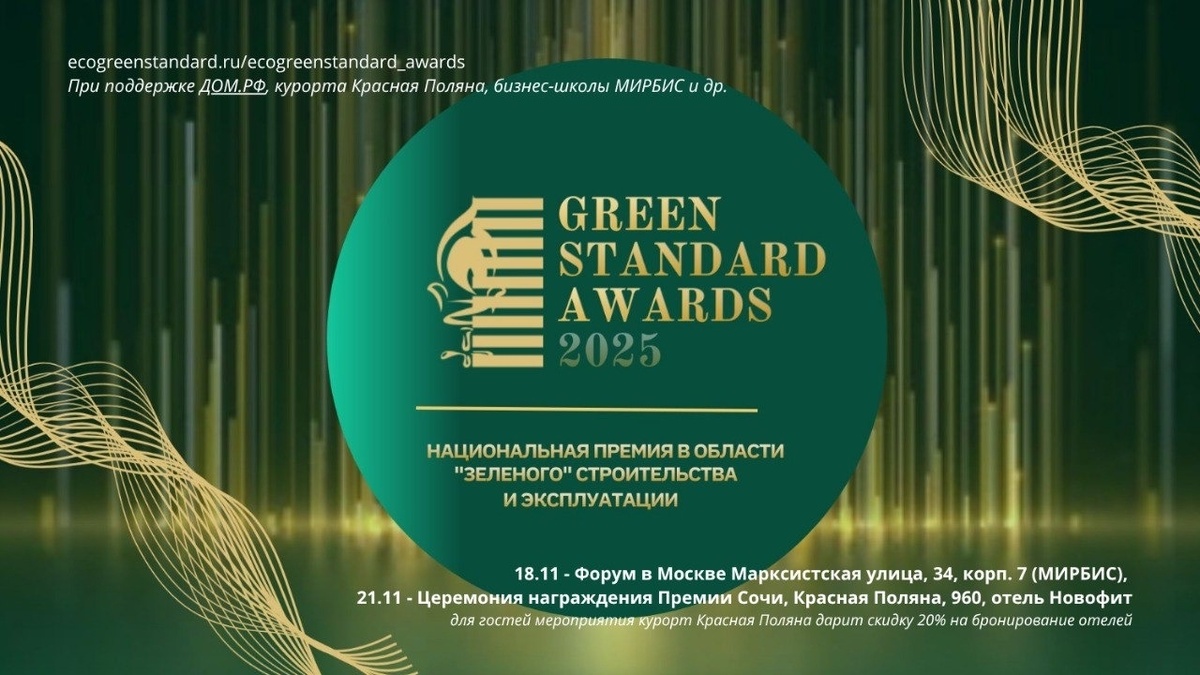 Продолжается регистрация гостей на Форум в Москве! 18 ноября. МИРБИС, Москва, Марксистская улица, 34, корп. 7 Программа со спикерами и тезисами » https://ecogreenstandard.ru/program_greenstandardawards_2025 Регистрация до 14 ноября» https://ecogreenstandard.ru/program_greenstandardawards_2025 Продолжается регистраций гостей в Сочи! Регистрация » https://ecogreenstandard.ru/program_greenstandardawards_2025 - 20 ноября (бесплатно только для участников GSA!): Выезд на производство органической косметики "Краснополянская косметика", где вы увидите улиточную ферму, увидите, как добывается гидралат и другие компоненты, узнаете как вообще отличить настоящую органическую косметику от гринвошинга и ужин-лекция с директором по охране окружающей среды курорта Красная Поляна Львом Шагаровым. Вас ждет рассказ об устойчивых практиках курорта и обзор отчета УР курорта. - 21 ноября: Церемония Премии и общий ужин в ресторане отеля Новофит. (На второго гостя от компании скидка 5.000 руб.) - 22 ноября