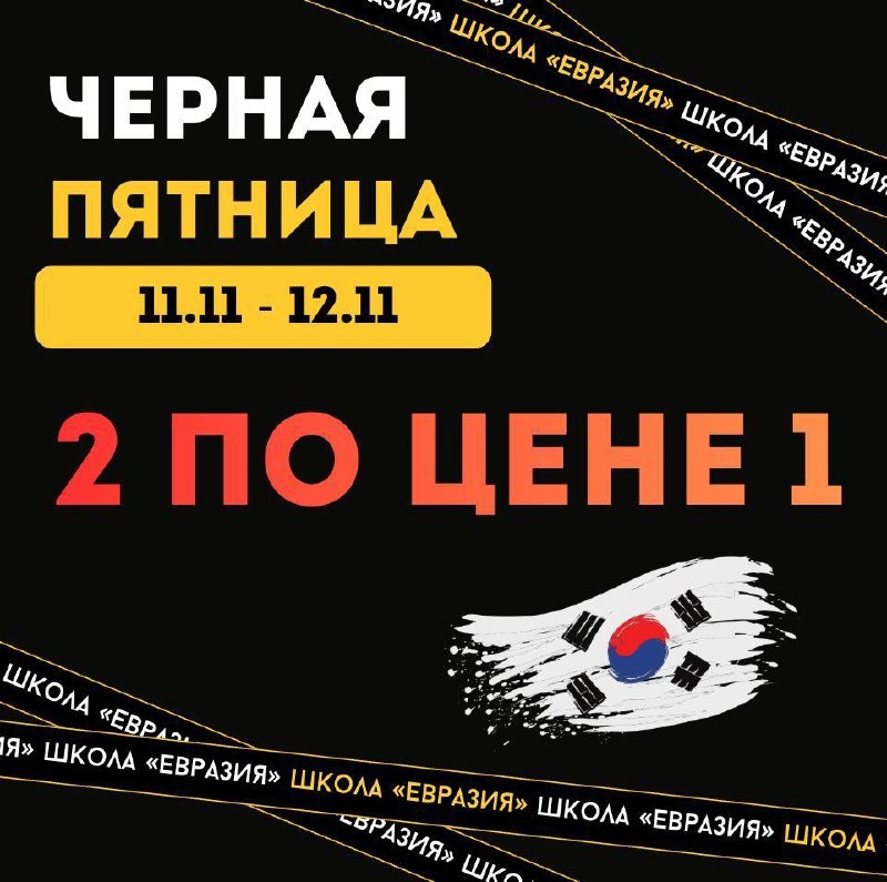 🖤 Чёрная пятница в разгаре — напоминаем про два главных предложения! ⭐️ 2 курса по цене 1 Можно собрать набор под свою цель: общий курс на платформе + тематический марафон, два марафона подряд или два направления обучения. Корейский 24/7, видеоуроки, тренажёры, практика — всё в двойном объёме по цене одного. ⭐️ Подарочный сертификат за 3500₽ вместо 5000₽ Идеально для новичков, продолжающих и тех, кто хочет вернуться. По сертификату можно выбрать любой курс или любой марафон: сленг, путешествия, дорамы, разговорная база, K-pop и многое другое. ⏳ Обе акции действуют только до сегодня, 23:59 по МСК. Забирай, пока ещё успеваешь. ➡️ Напиши BLACKKOREA в @Eurasia_online_help_bot