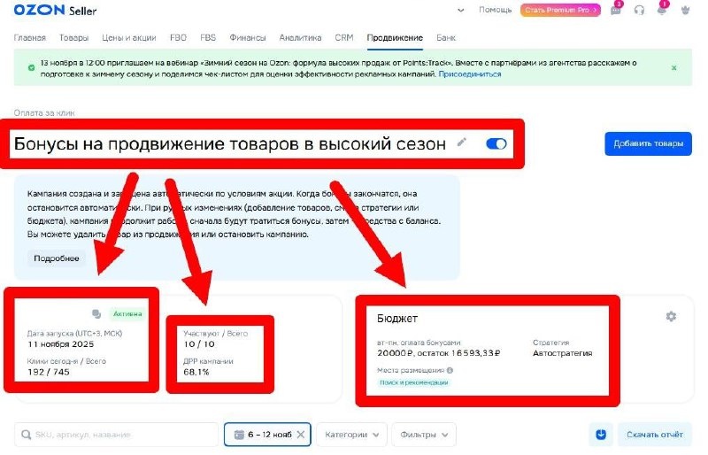 Ozon сам запускает рекламные кампании за селлеров. И есть нюанс. Селлер прислал скрин: в его кабинете появилась рекламная кампания, созданная автоматически. Он её не запускал — Ozon сам выбрал стратегию, добавил товары, назначил бюджет и списывает «бонусы». На скрине указано: «Кампания создана и запущена автоматически по условиям акции. Когда бонусы закончатся, она остановится. При ручных изменениях (добавление товаров, изменение стратегии или бюджета) — продолжит работать уже за счёт ваших средств». То есть — пока не трогаешь кампанию, она идёт на бонусах. Но стоит что-то изменить — и Оzon начнёт списывать рубли с баланса селлера. Будьте внимательны: проверьте вкладку «Продвижение → Оплата за клик» — нет ли там “подарков”, которые начнут работать за ваш счёт после первого клика в настройках. Marketplace_biz - отдай свой буст каналу